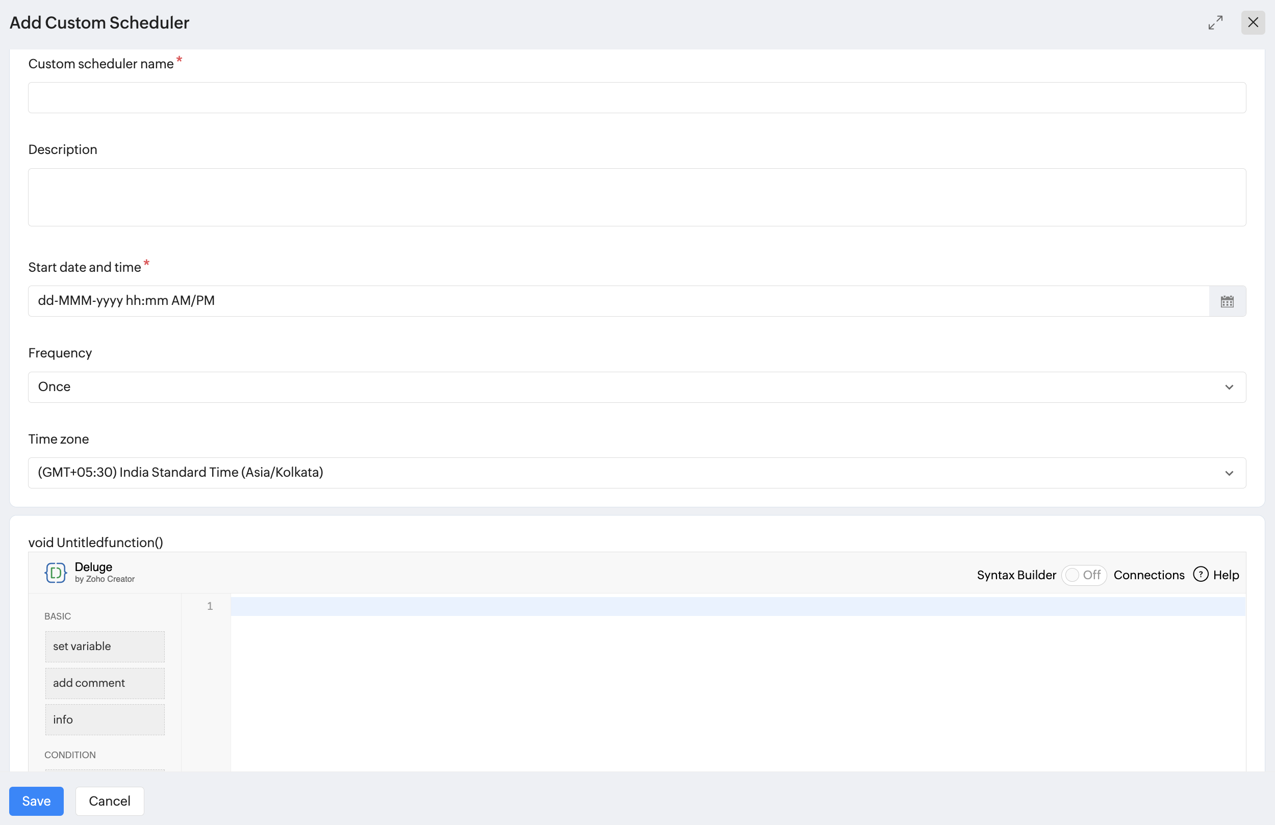 Custom Functions allows you to customize a lot of commonly used functions thereby helping you save time. Custom Scheduler is an add-on to the existing Custom Functions. Using the Custom Scheduler, you will be able to create a scheduler which will automatically perform the actions of a particular Custom Function, at the time specified by you. While custom functions will be triggered based on workflow actions, custom schedulers do not need any workflow actions for them to get triggered.