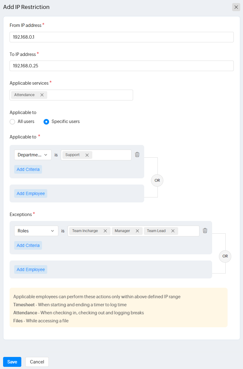 In the example shown below, IP restriction is applicable for all Support department employees, except for those in senior roles such as Managers, Team Incharge, Team Leads.