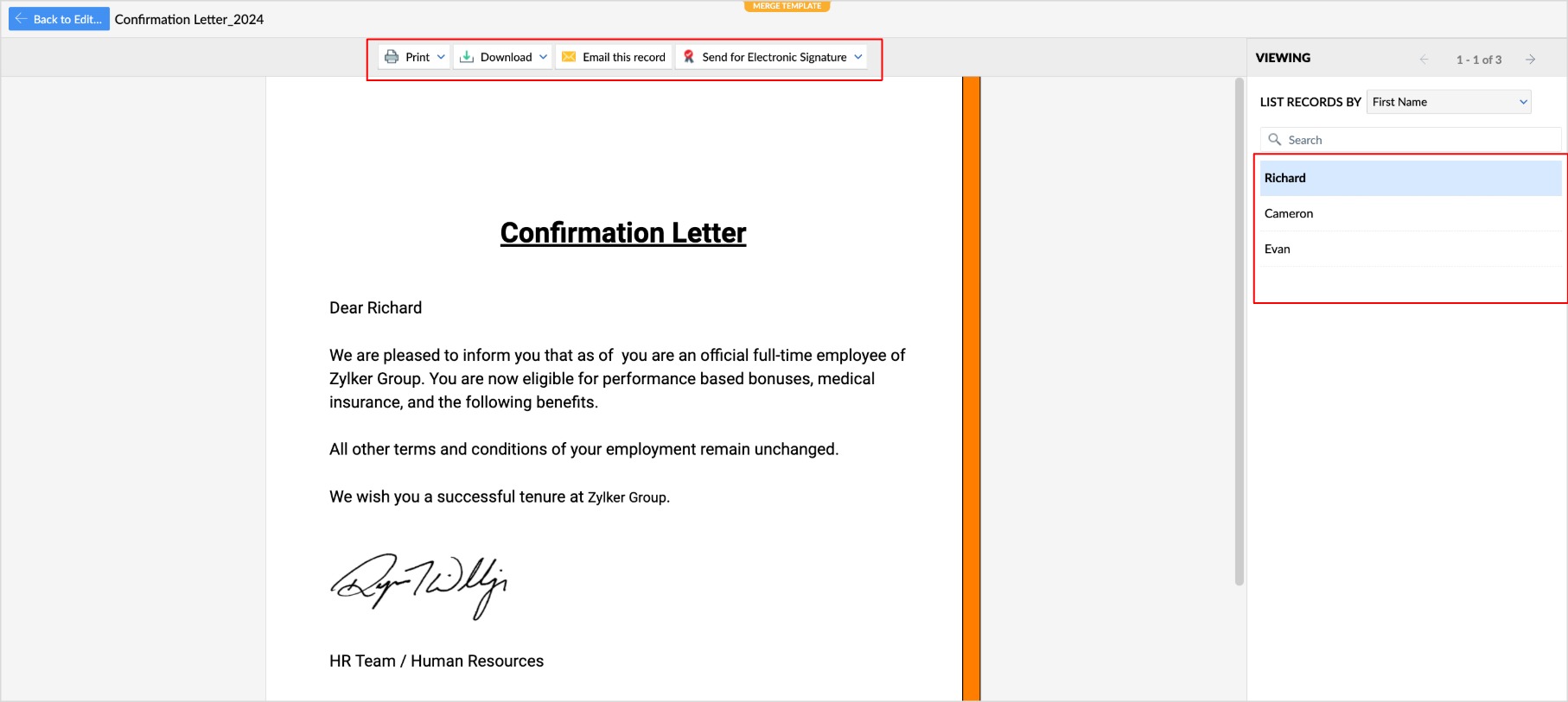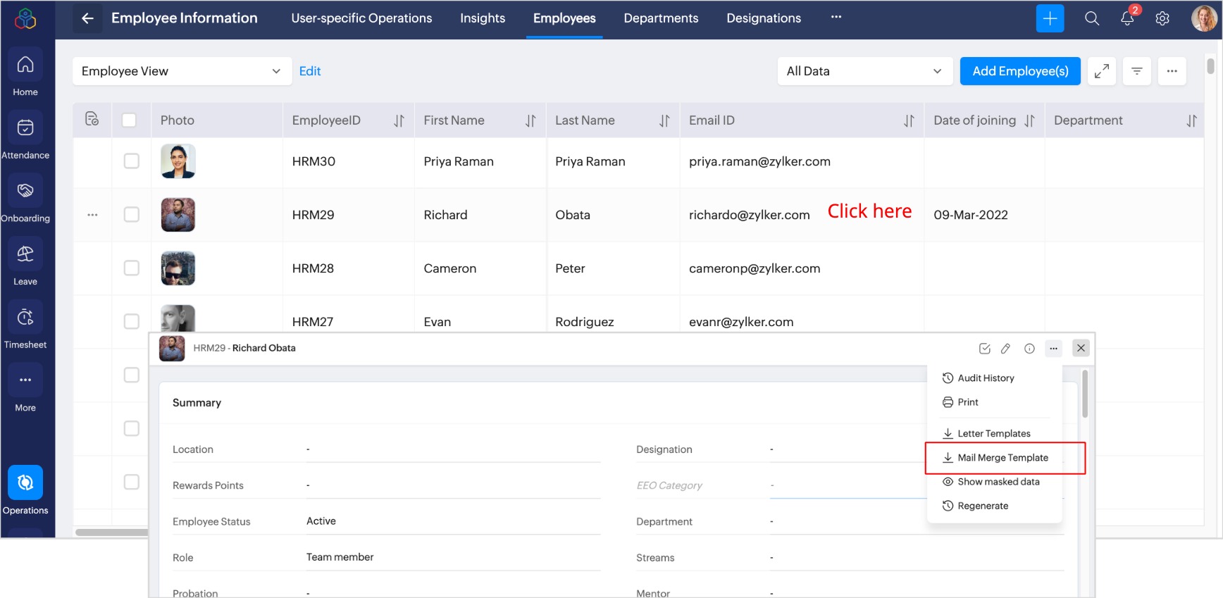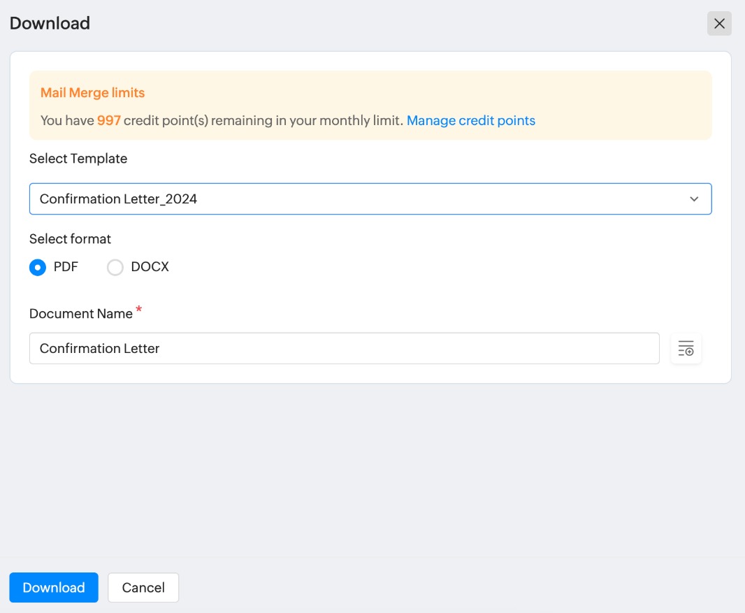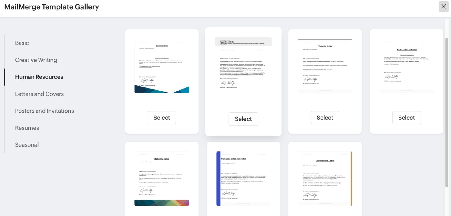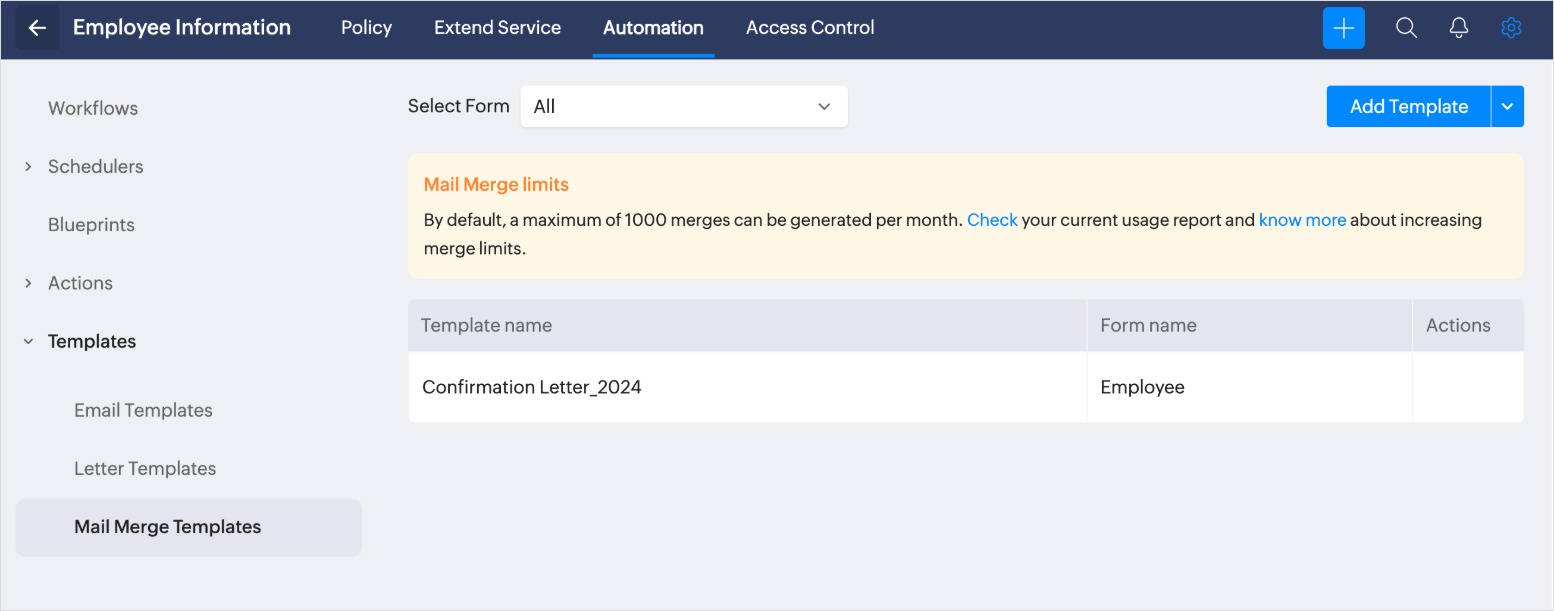 Mail merge templates in Zoho People are used to create and send personalized documents to your employees. This feature is useful when you need to send standard documents to multiple employees in your organization. The templates include letter content and placeholders for specific employee information, such as names, addresses, job titles, and other relevant details. These placeholders are automatically populated with data from the associated form or record, allowing you to generate and send personalized documents efficiently.