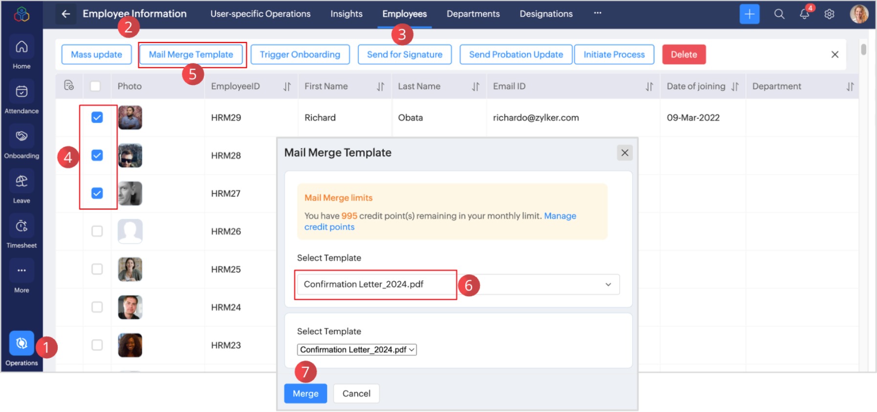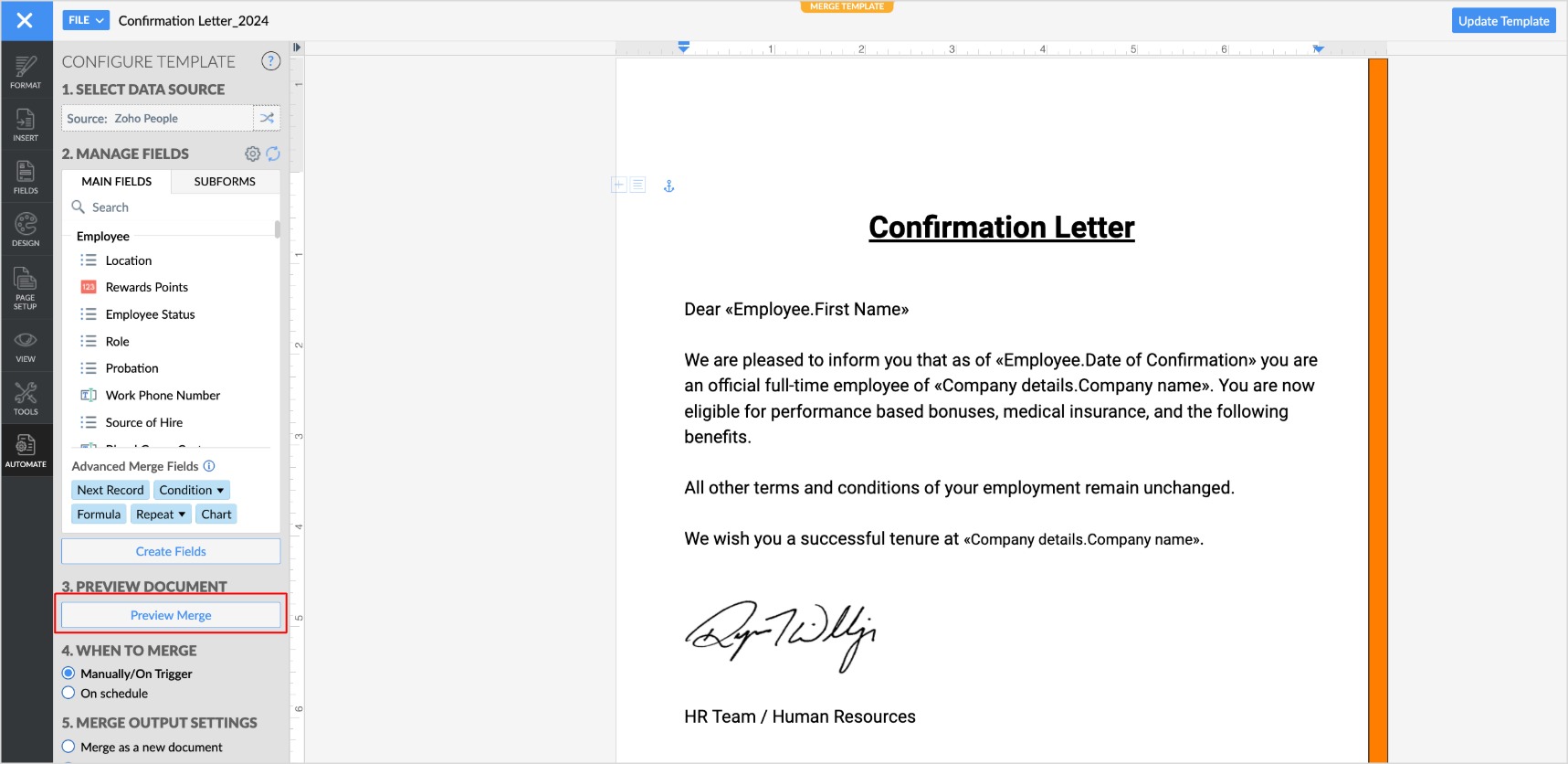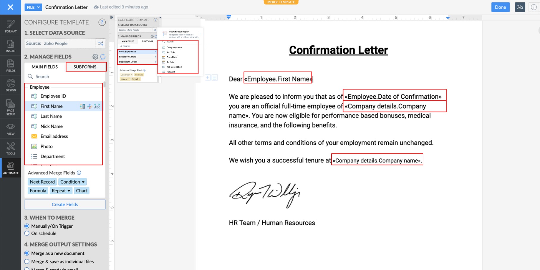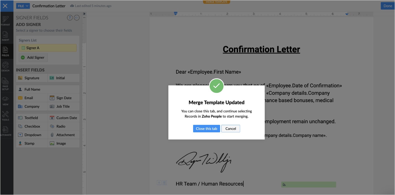 Mail merge templates in Zoho People are used to create and send personalized documents to your employees. This feature is useful when you need to send standard documents to multiple employees in your organization. The templates include letter content and placeholders for specific employee information, such as names, addresses, job titles, and other relevant details. These placeholders are automatically populated with data from the associated form or record, allowing you to generate and send personalized documents efficiently.