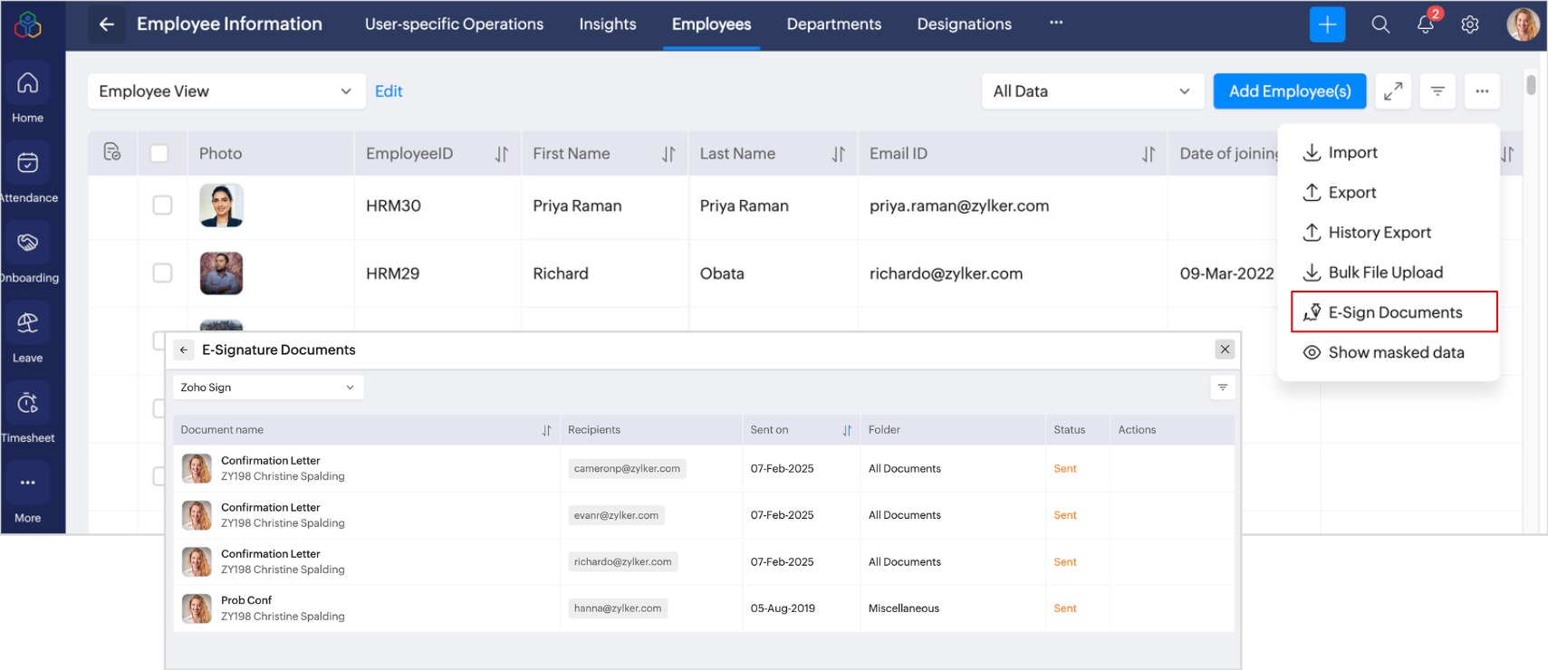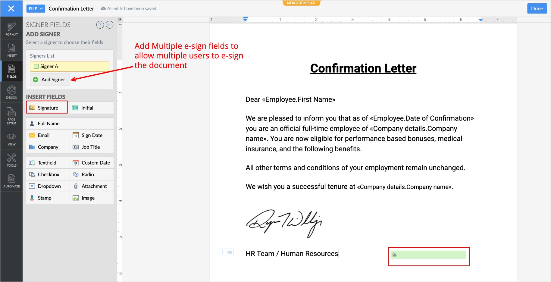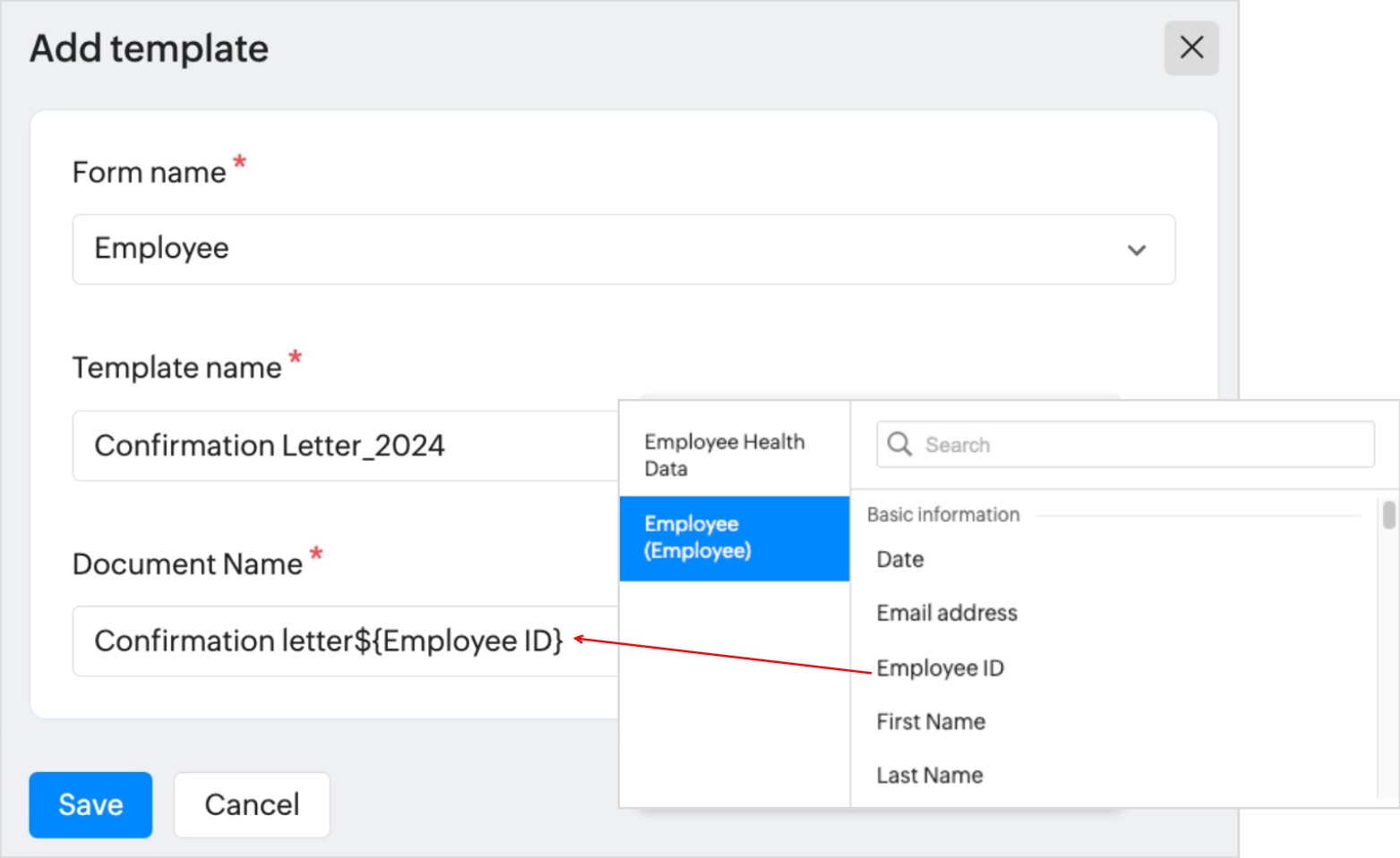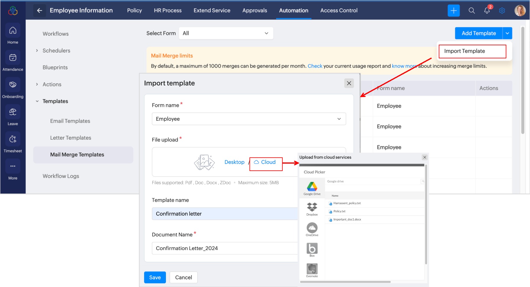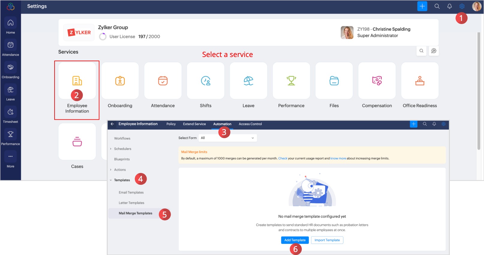 Mail merge templates in Zoho People are used to create and send personalized documents to your employees. This feature is useful when you need to send standard documents to multiple employees in your organization. The templates include letter content and placeholders for specific employee information, such as names, addresses, job titles, and other relevant details. These placeholders are automatically populated with data from the associated form or record, allowing you to generate and send personalized documents efficiently.
