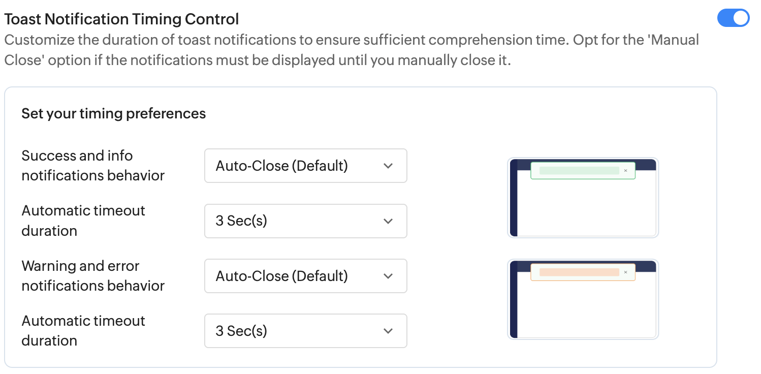 Customize the duration of toast notifications to ensure sufficient comprehension time. Opt for the 'Manual Close' option if notifications must stay until you close them.