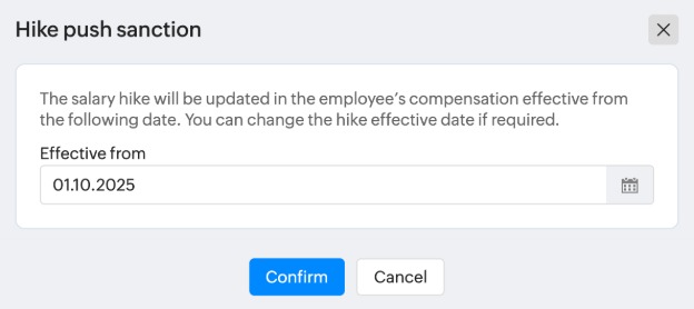 Select the required 'Effective from' date, the salary of the employee will be updated on Confirming, effective from the date selected here. Click Confirm to finalize.