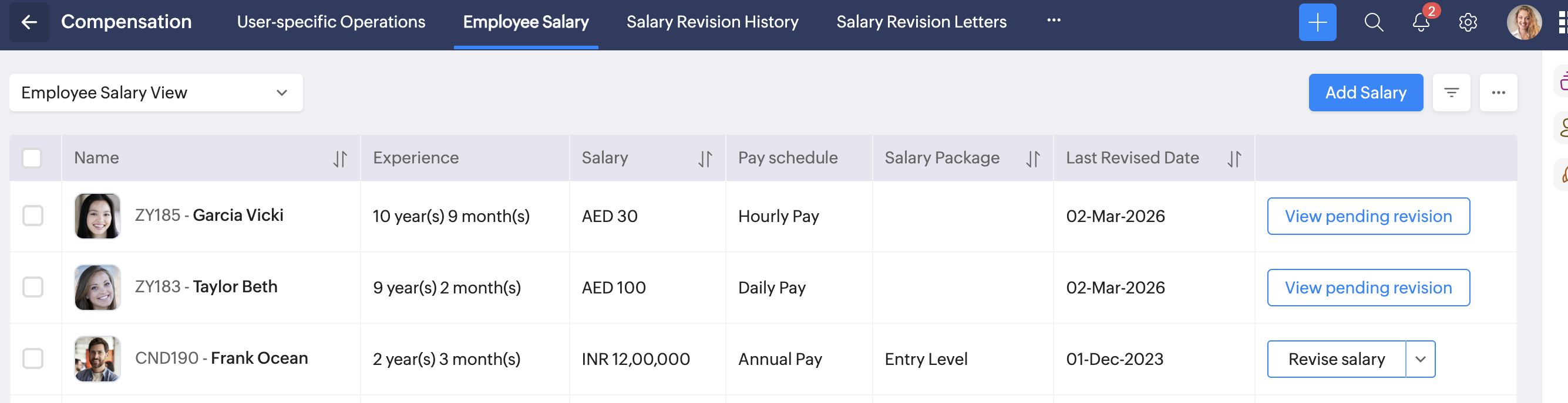 To view Salary Revision History, approve, reject, cancel revision, generate revision letters, navigate to Operations > Compensation > Salary Revision History tab. Revision letter status will also be displayed here.