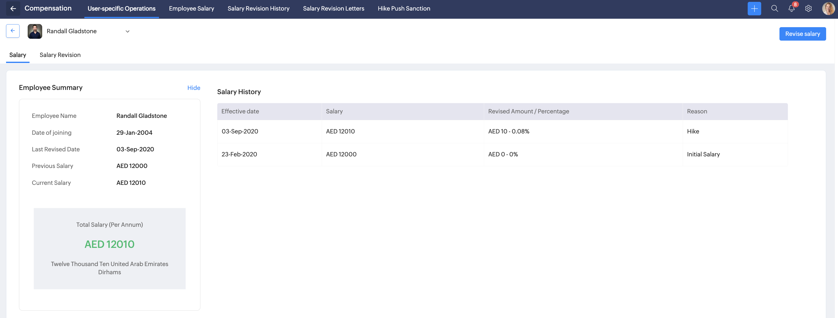 The compensation administrator can delete the latest salary revision record of an employee. On deleting a salary revision record. The salary will be reverted to its previous state (before the revision).