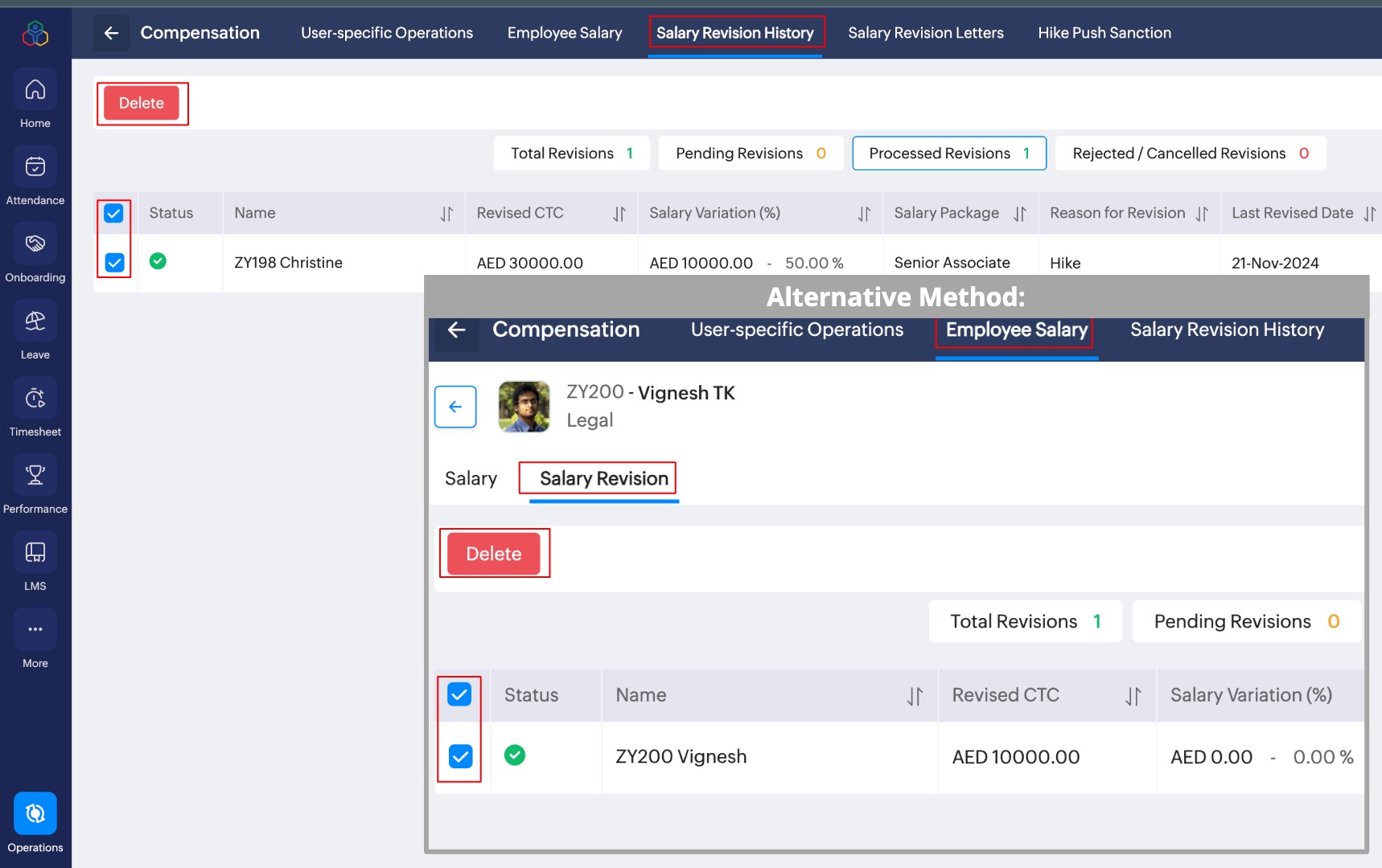 Only the latest salary revision can be deleted using this method. i.e., intermediate or previous revisions cannot be deleted using this method.
