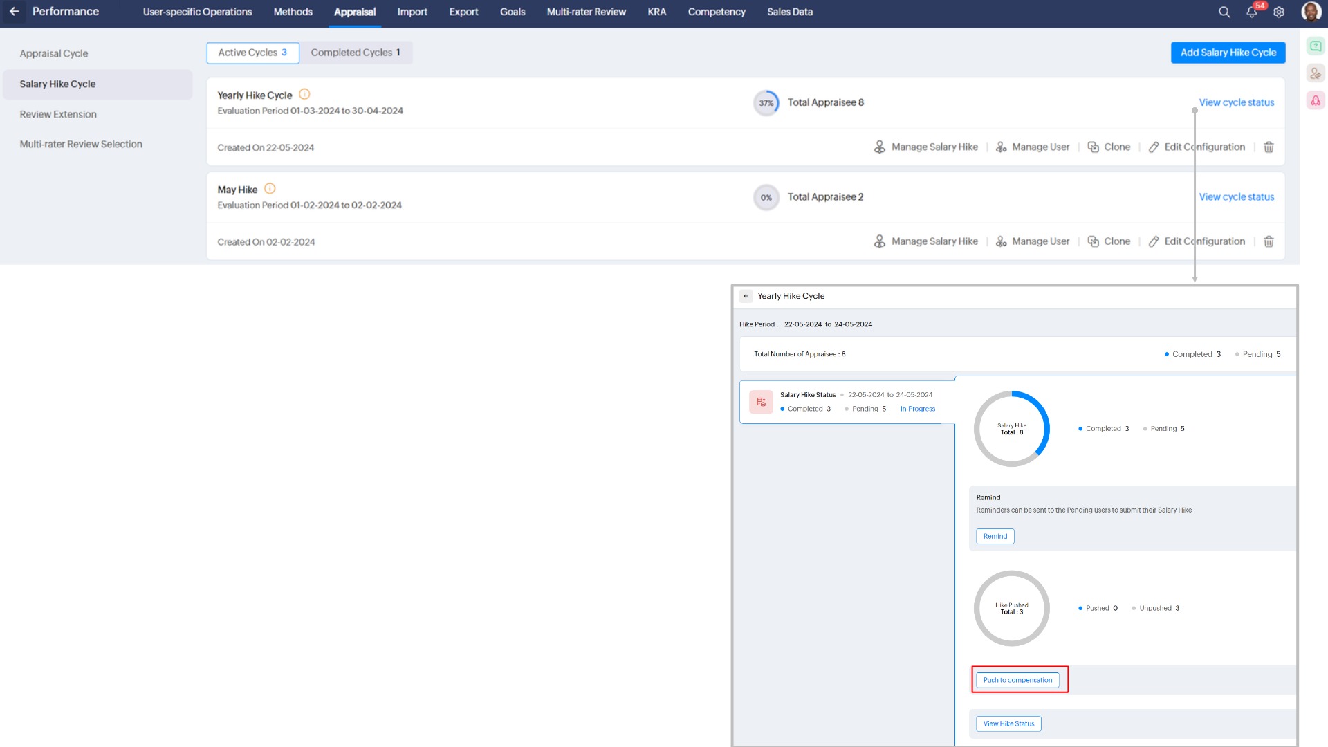 Once salary hikes are completed in performance, the next step will be to push the salary hikes to compensation. To view the salary hike status in performance, click on the corresponding appraisal cycle name in the list view. (Operations > Performance > Appraisal > Select a cycle > View Cycle Status > Push to Compensation)