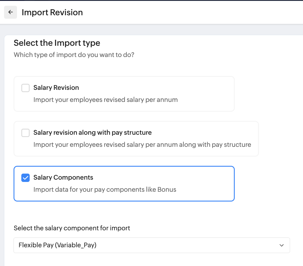 - When using the second option, you can select the pay structure the imported data corresponds to. Or if the third option is used, choose the specific salary component that the imported data corresponds to.