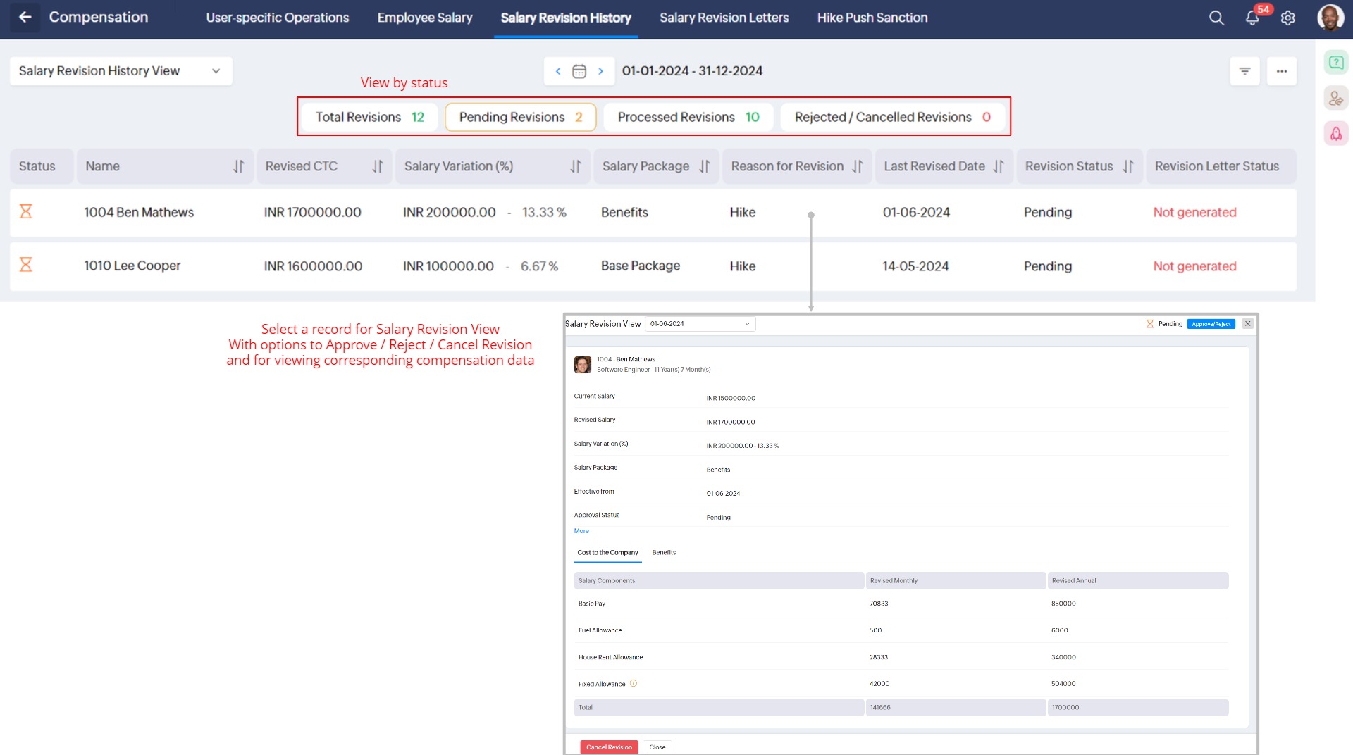 Click on a record for employee specific compensation data, and to Approve / Reject or Cancel salary revison from the Salary Revision View.