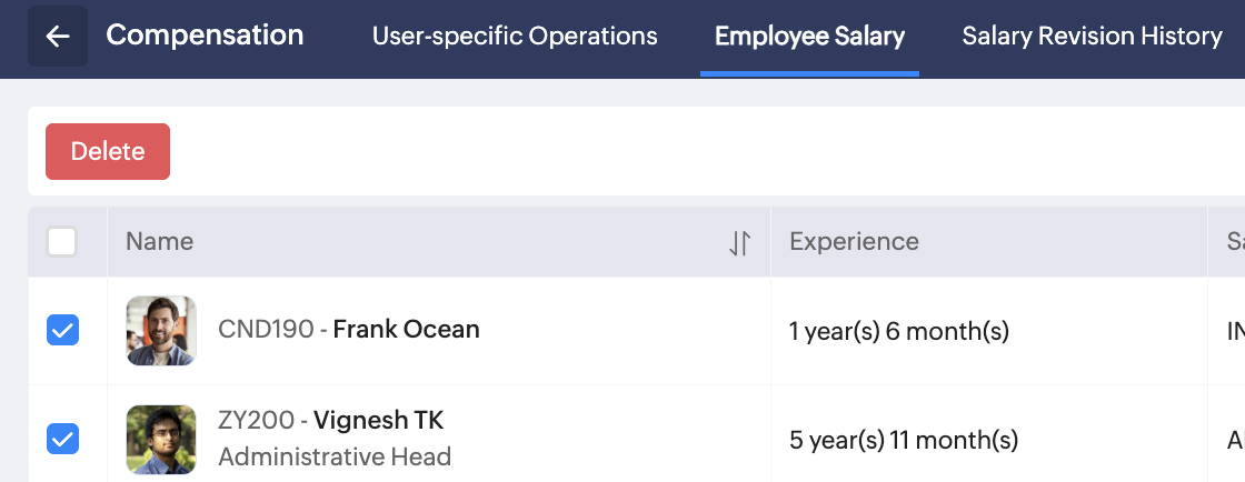 - Select the required salary revision records using the provided checkbox and click Delete.