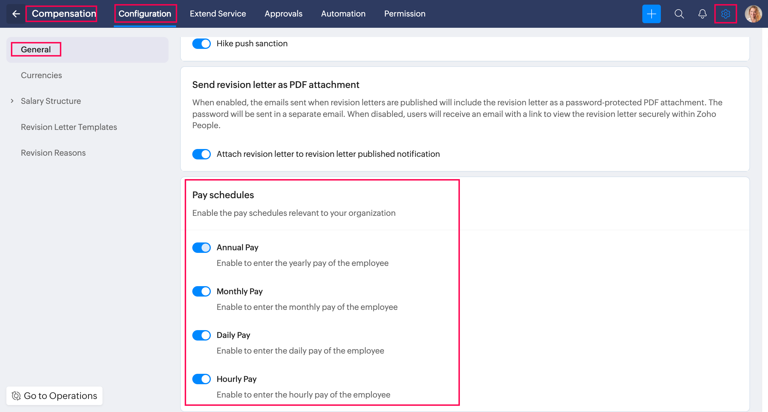 To configure compensation settings in Zoho People, go to Settings > Configuration > Compensation tab.