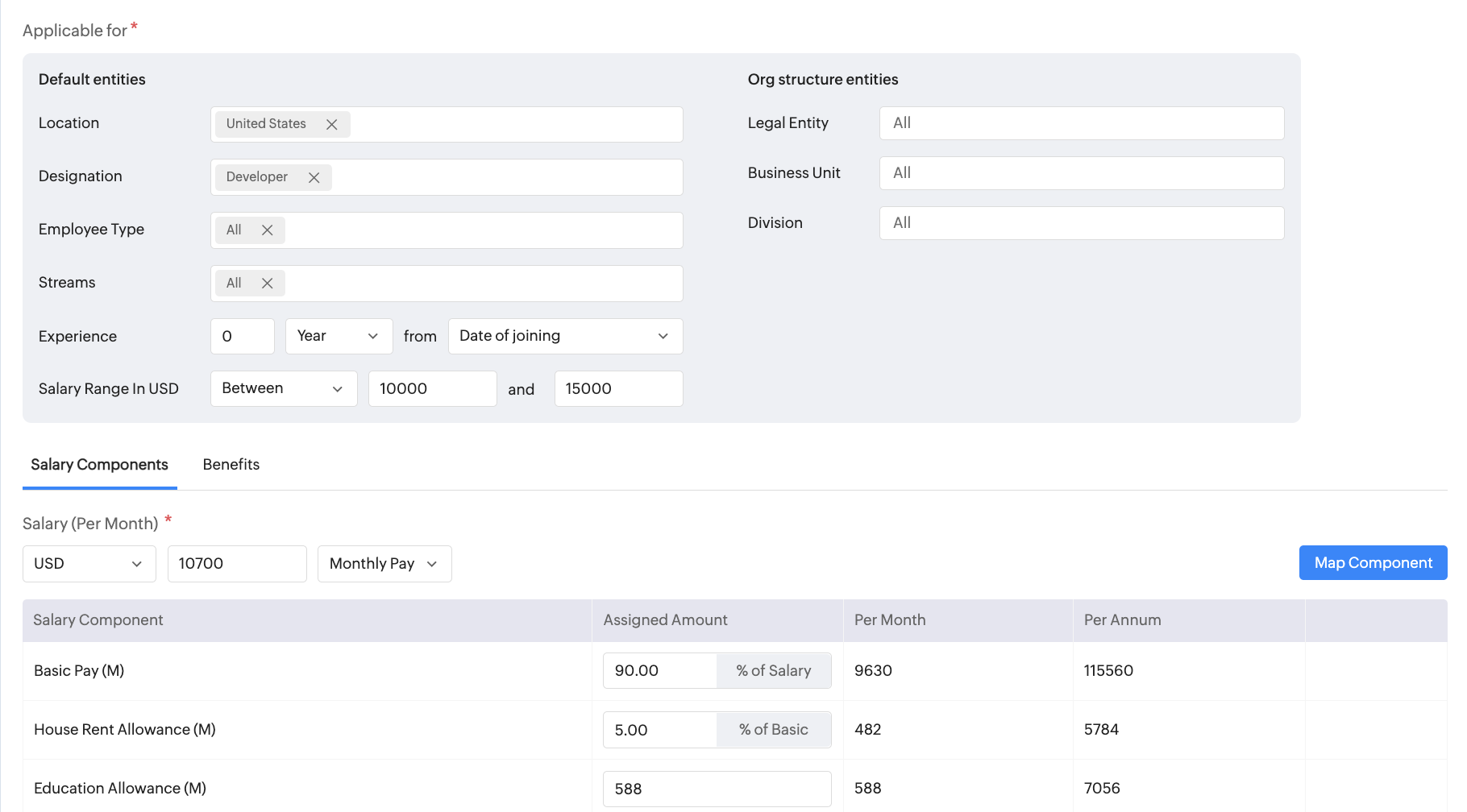 Salary structure is useful if your organization wants to store detailed salary information. This is suitable when you want to store salary along with salary component breakup.