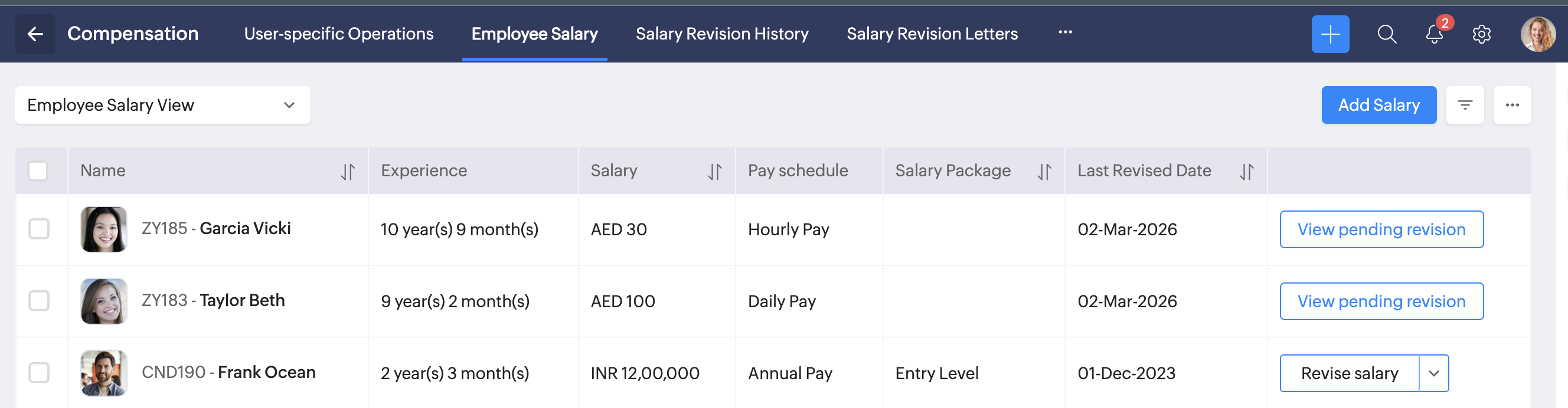 To view a record of employee salaries, navigate to Operations > Compensation > Employee Salary tab.