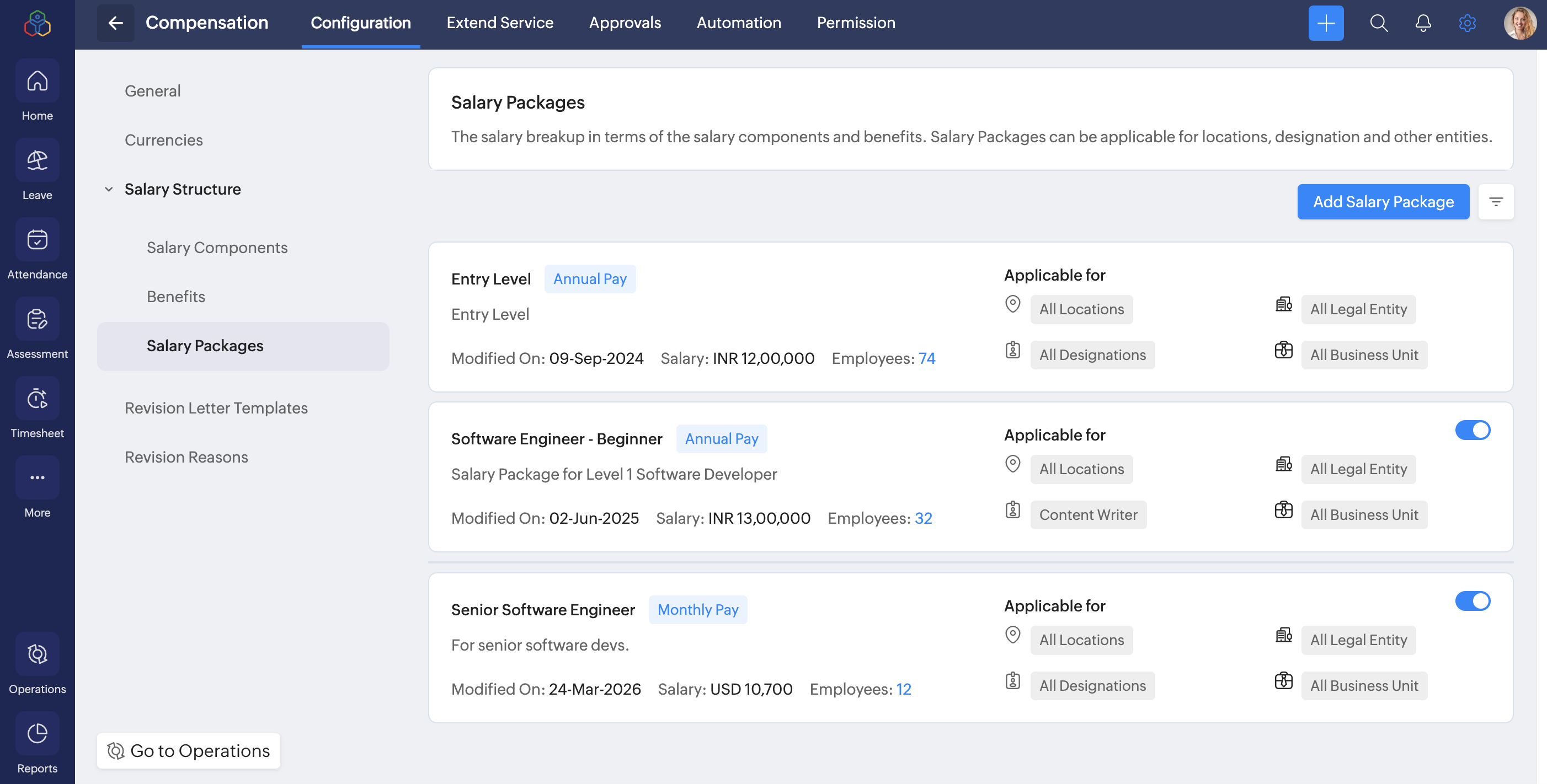 - To add a salary package, navigate to Settings > Compensation > Configuration > Salary Structure > Salary Package