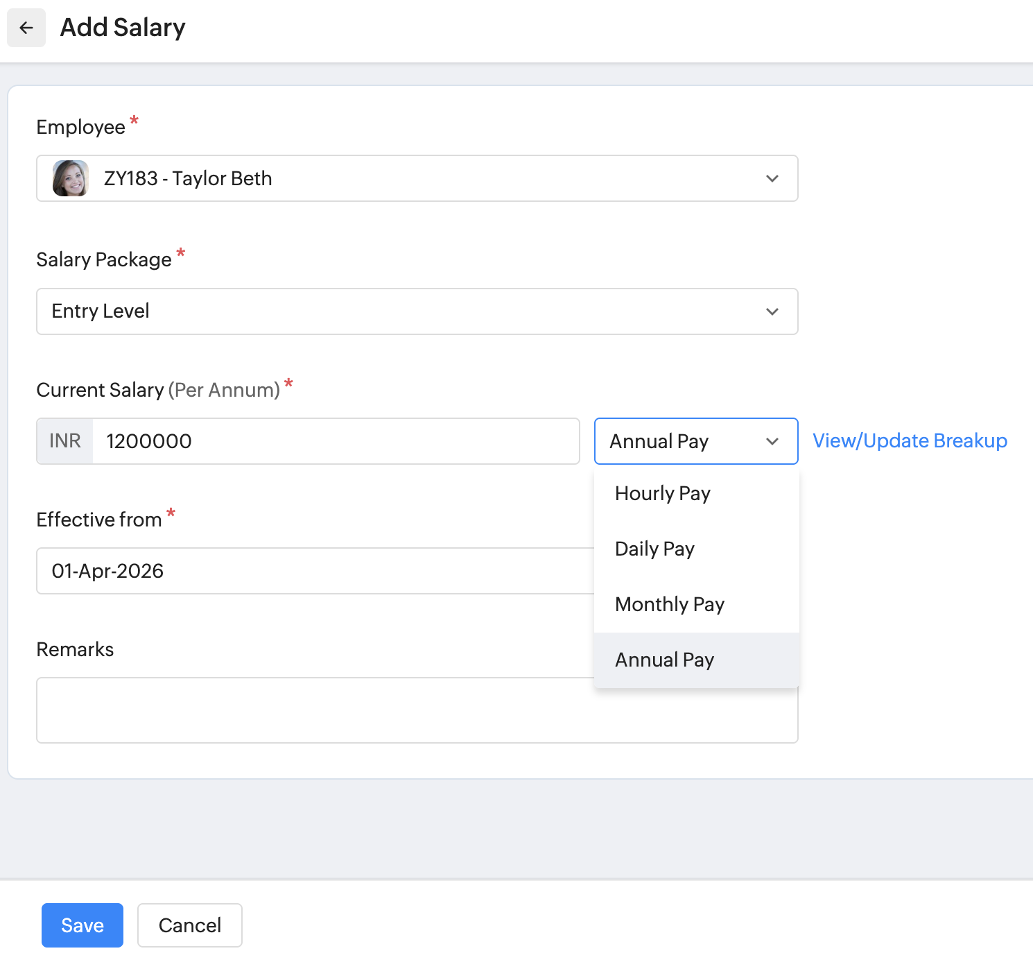 This option tracks only the employee’s total pay (cost to the company) without detailing the individual components. It helps maintain a basic salary record and captures historical changes in total pay over time. - Detailed Employee Pay Tracking with Benefits and Breakup