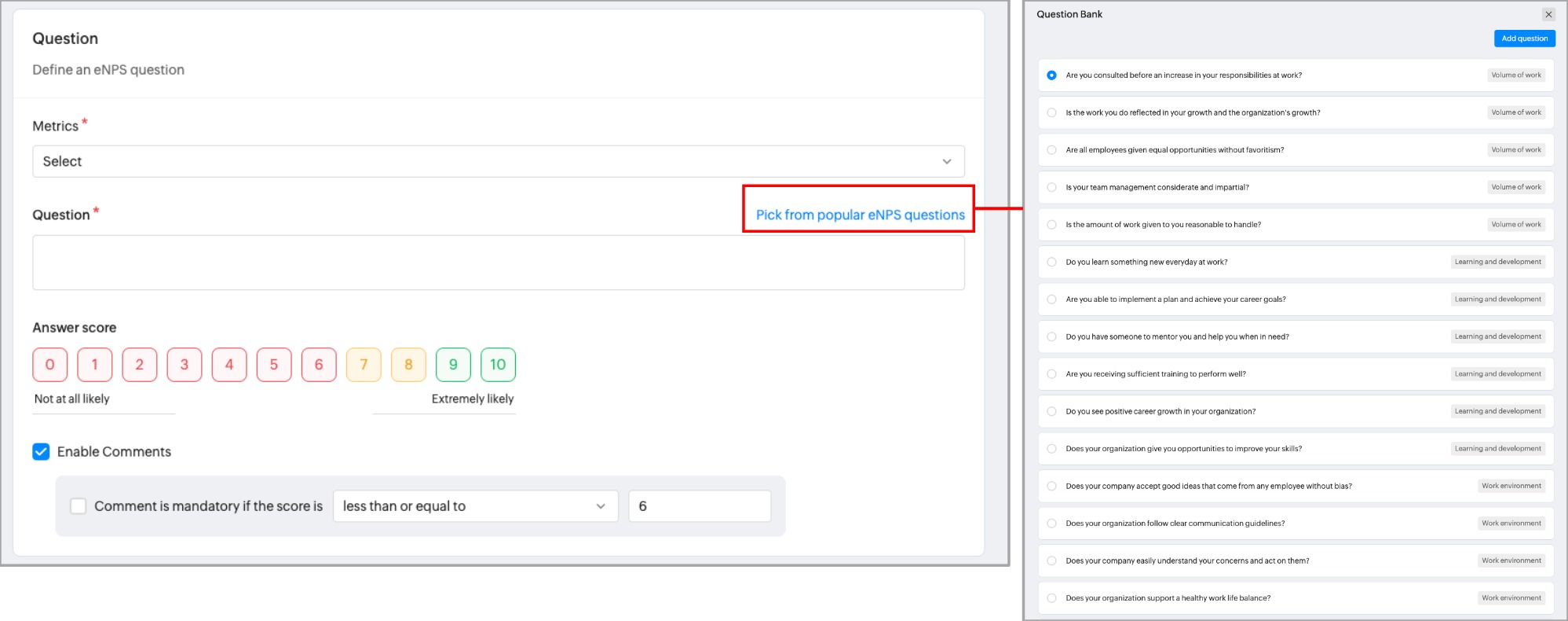 7. On the question field enter your eNPS question or click Pick from popular eNPS questions to add a question from question bank.