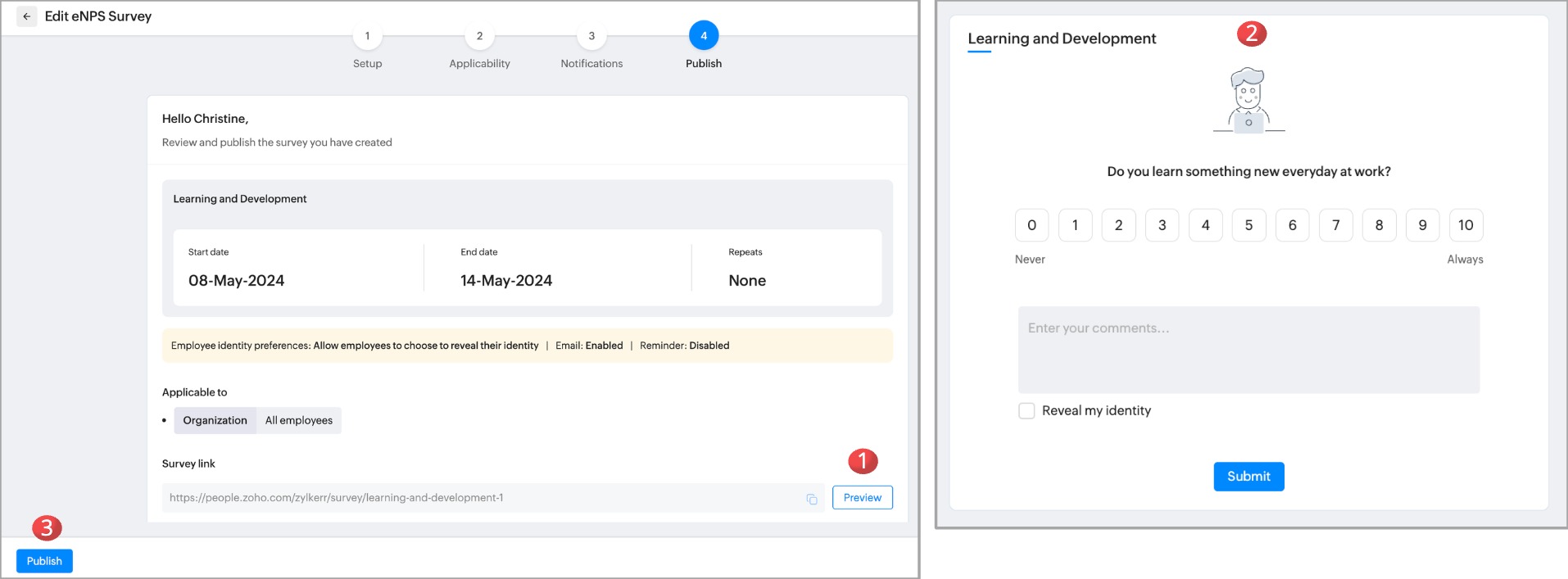 1. Published surveys are available in Employee Engagement > eNPS Survey tab.