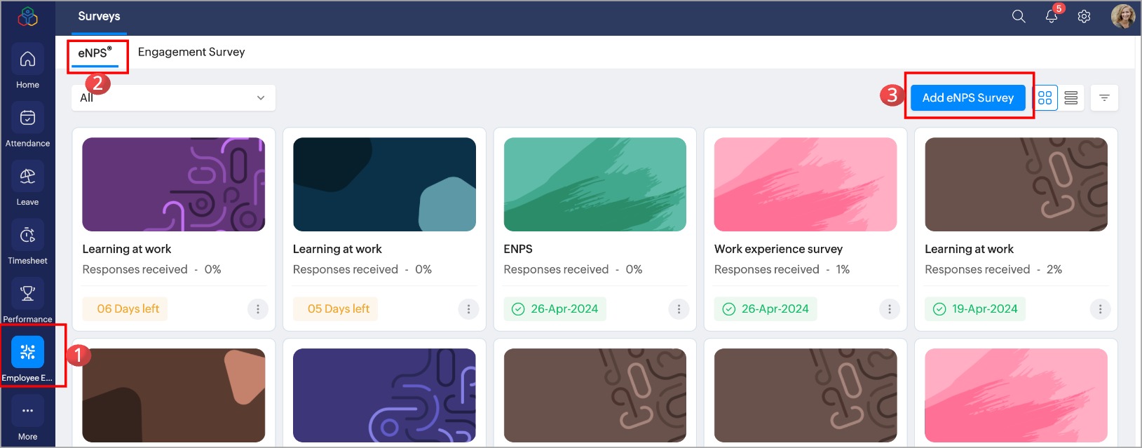 1. To add a new eNPS survey, go to Employee Engagement > eNPS > Add eNPS Survey.