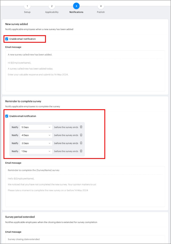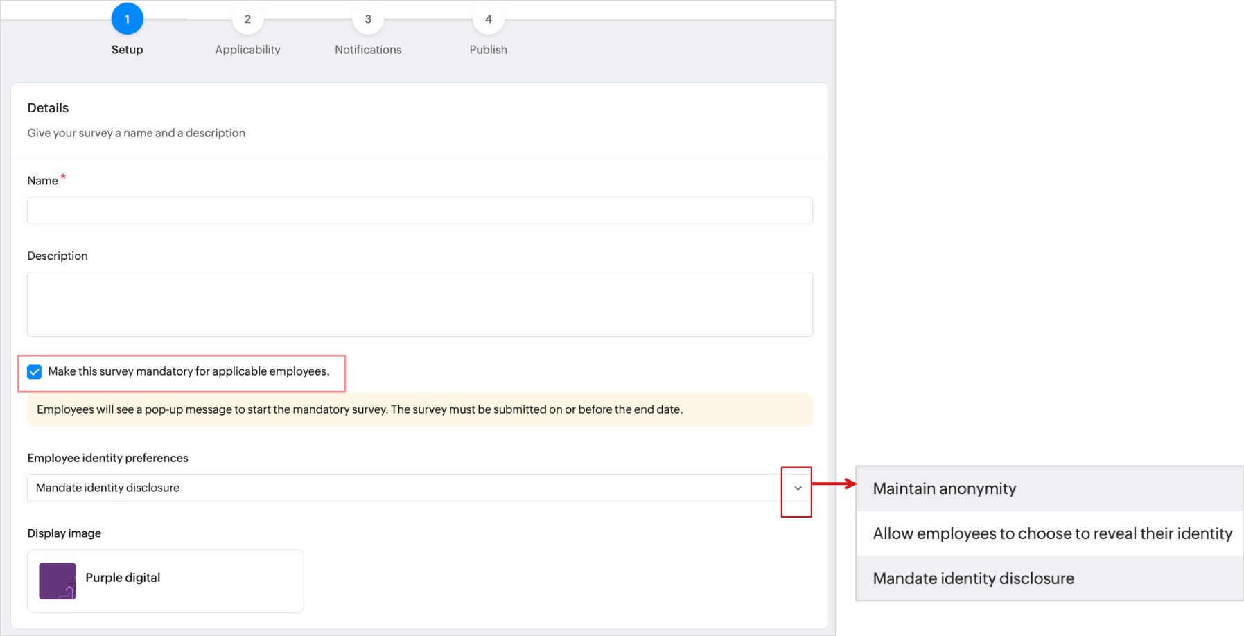 3. You can set the survey as mandatory by selecting the Make this survey mandatory for applicable employees checkbox.