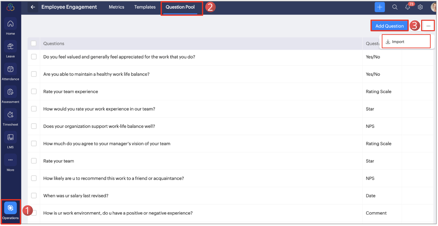 1. From home page, go to Operations > View all > Employee Engagement > Question Pool and click Add Question.