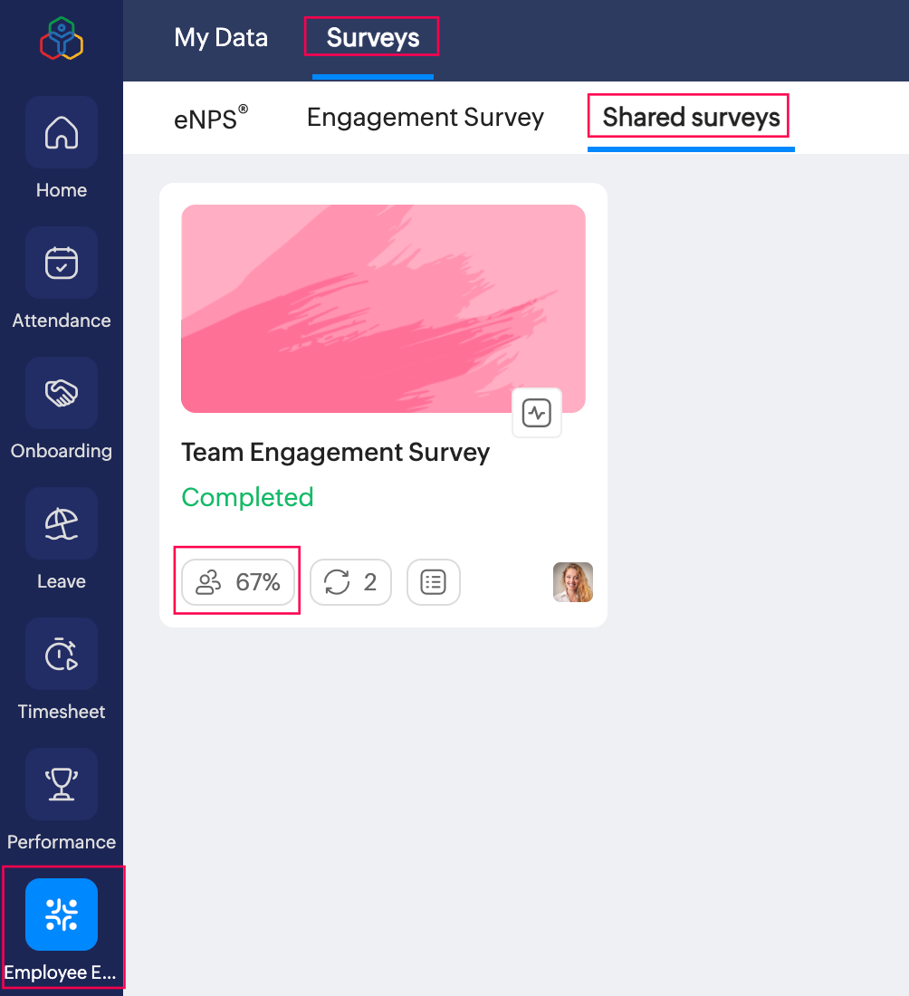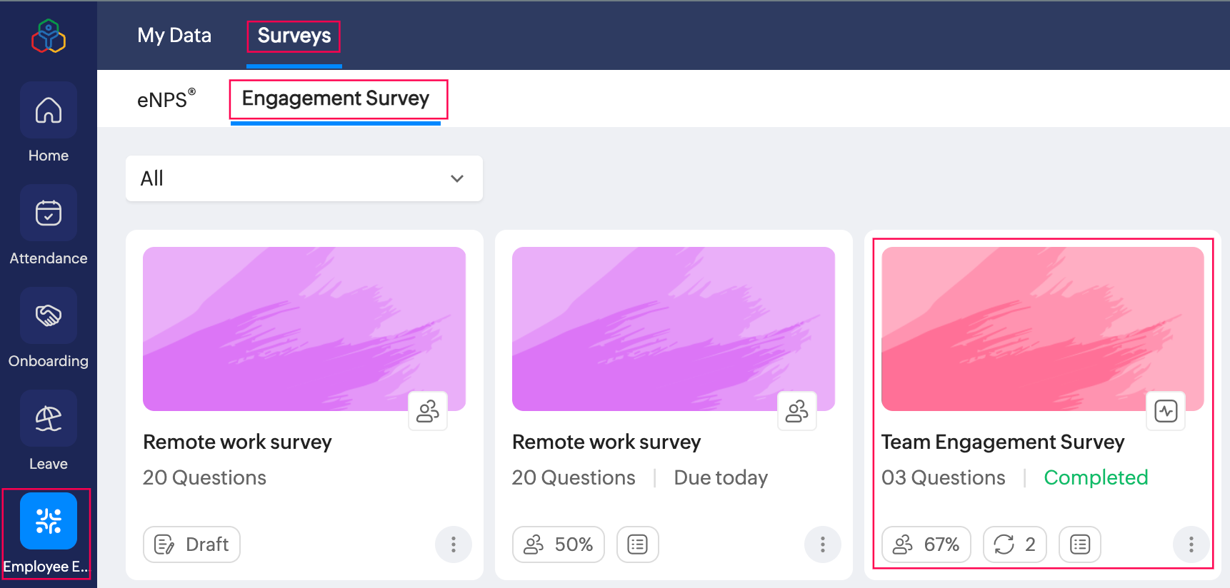 - Survey Participation: A color-coded donut chart that indicates the participation in the survey using 3 colors. Green: Completed | Yellow: In-progress | Grey: Not-taken. The corresponding percentage and values are also indicated.