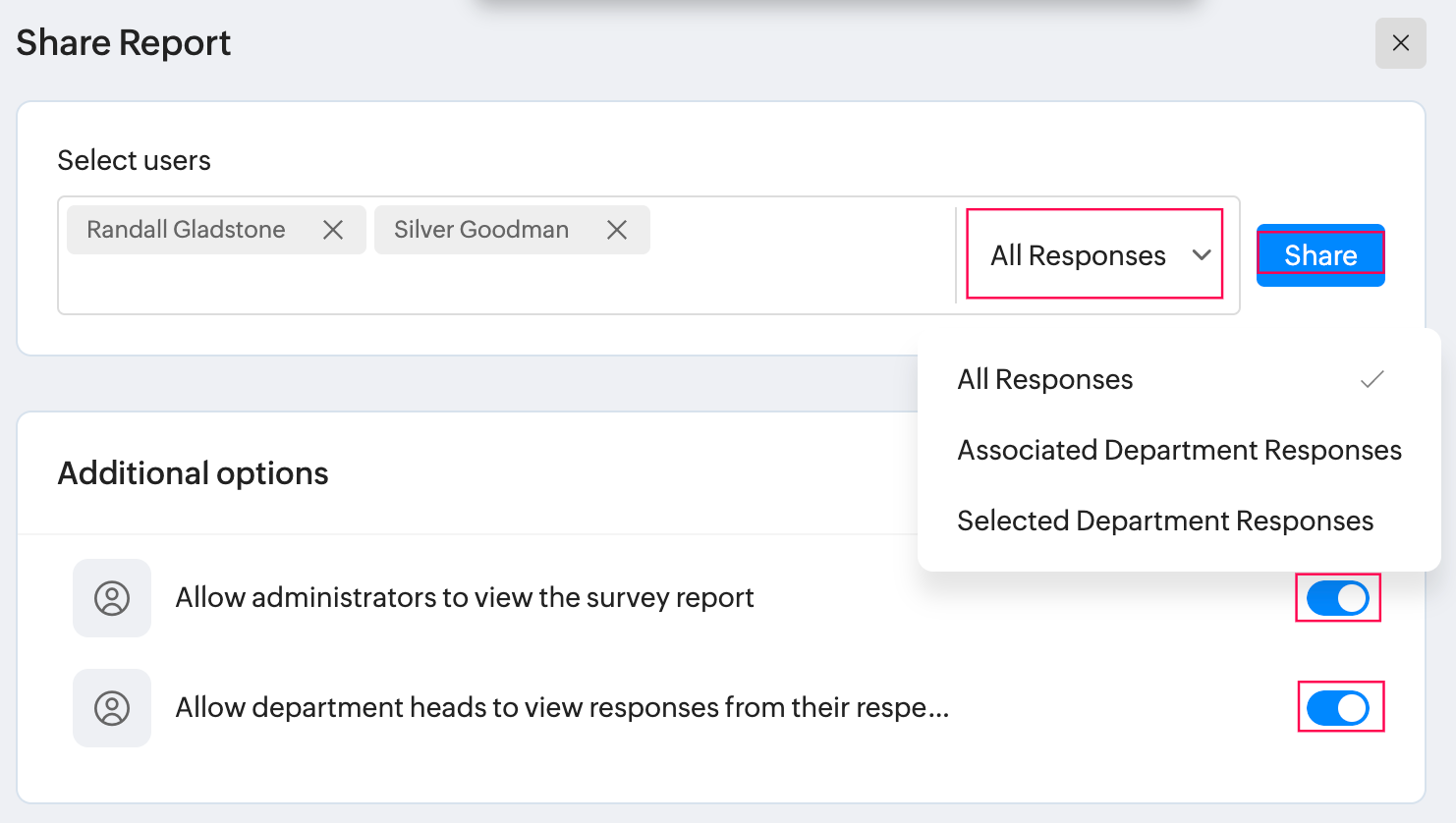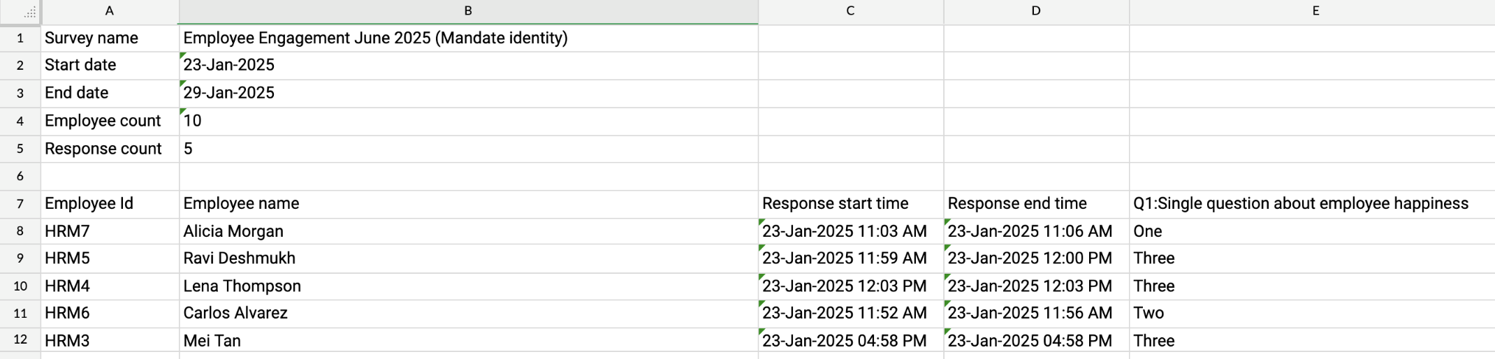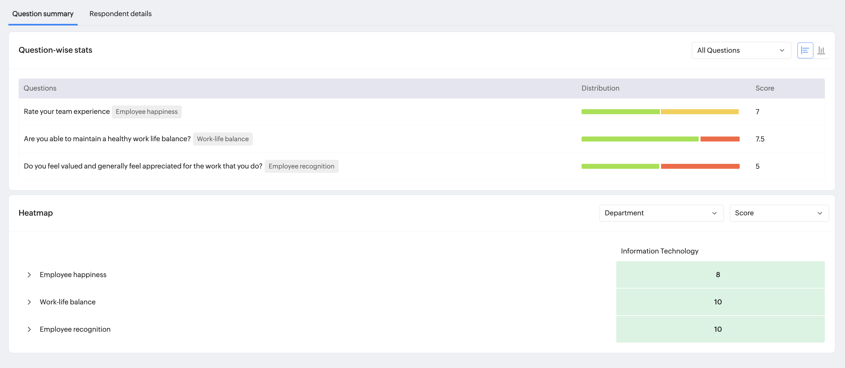 - Question-wise stats: A color-coded horizontal question-wise representation of responses ranging from favorable to unfavorable. A bar chart view is also available, and the sorting can also be customized.