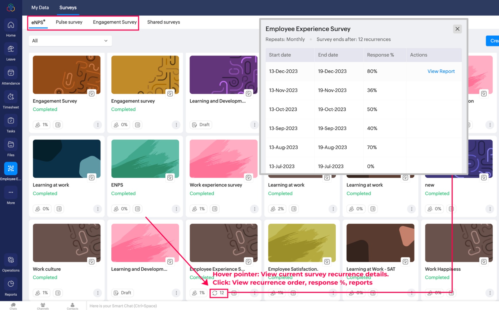 eNPS, Pulse, and Engagement surveys can be setup to run multiple times. You can view the recurrence order, response % and access corresponding reports directly,  To view this option, click on the Recurrence icon  () .