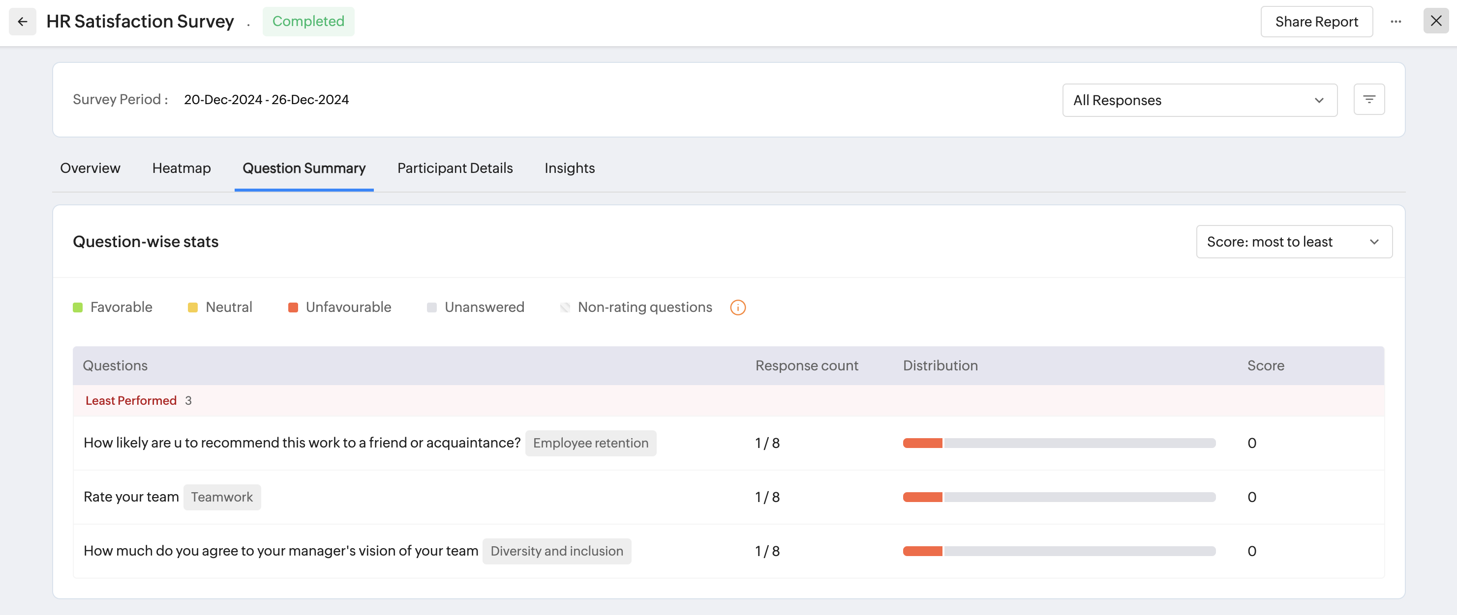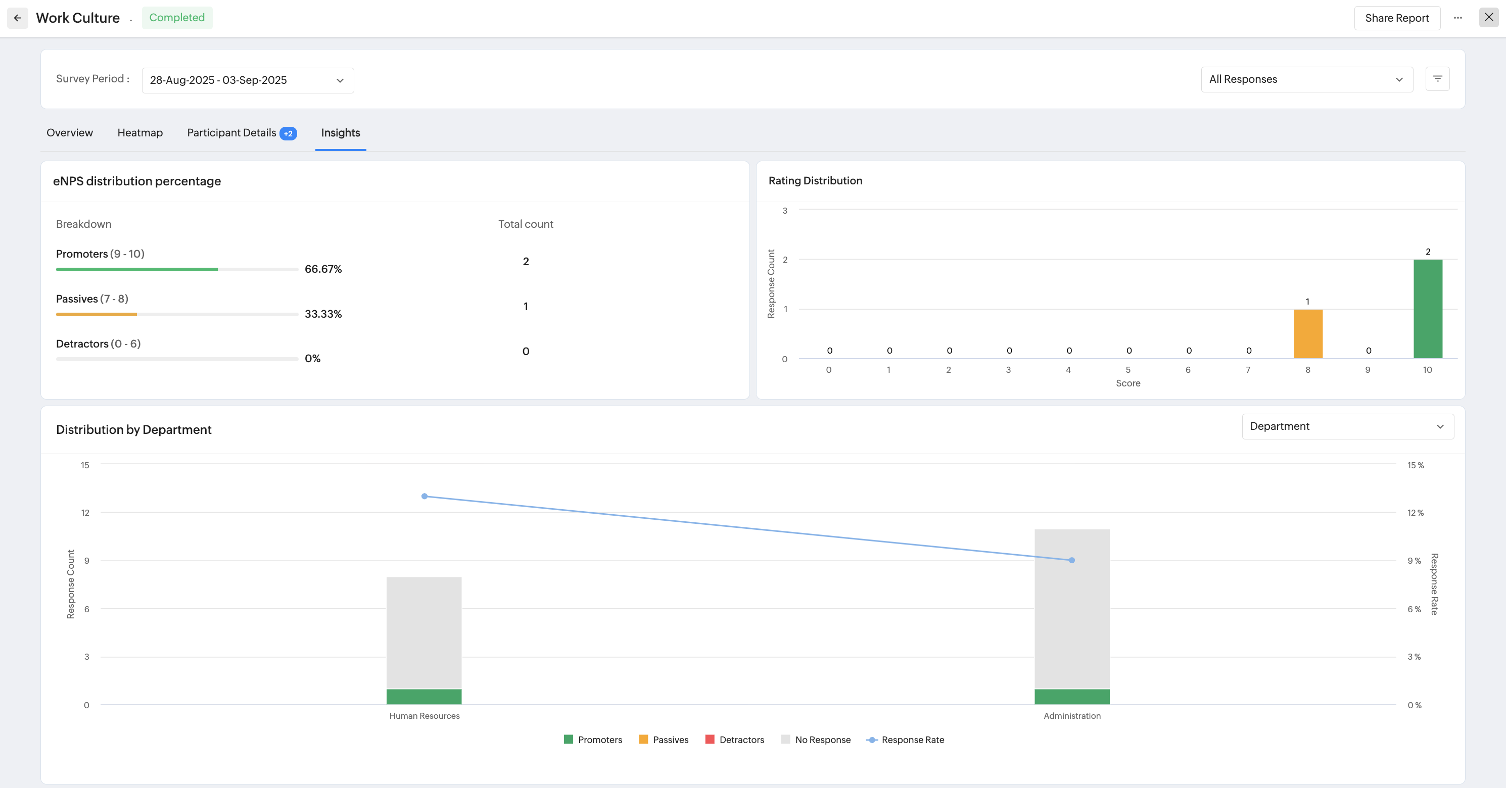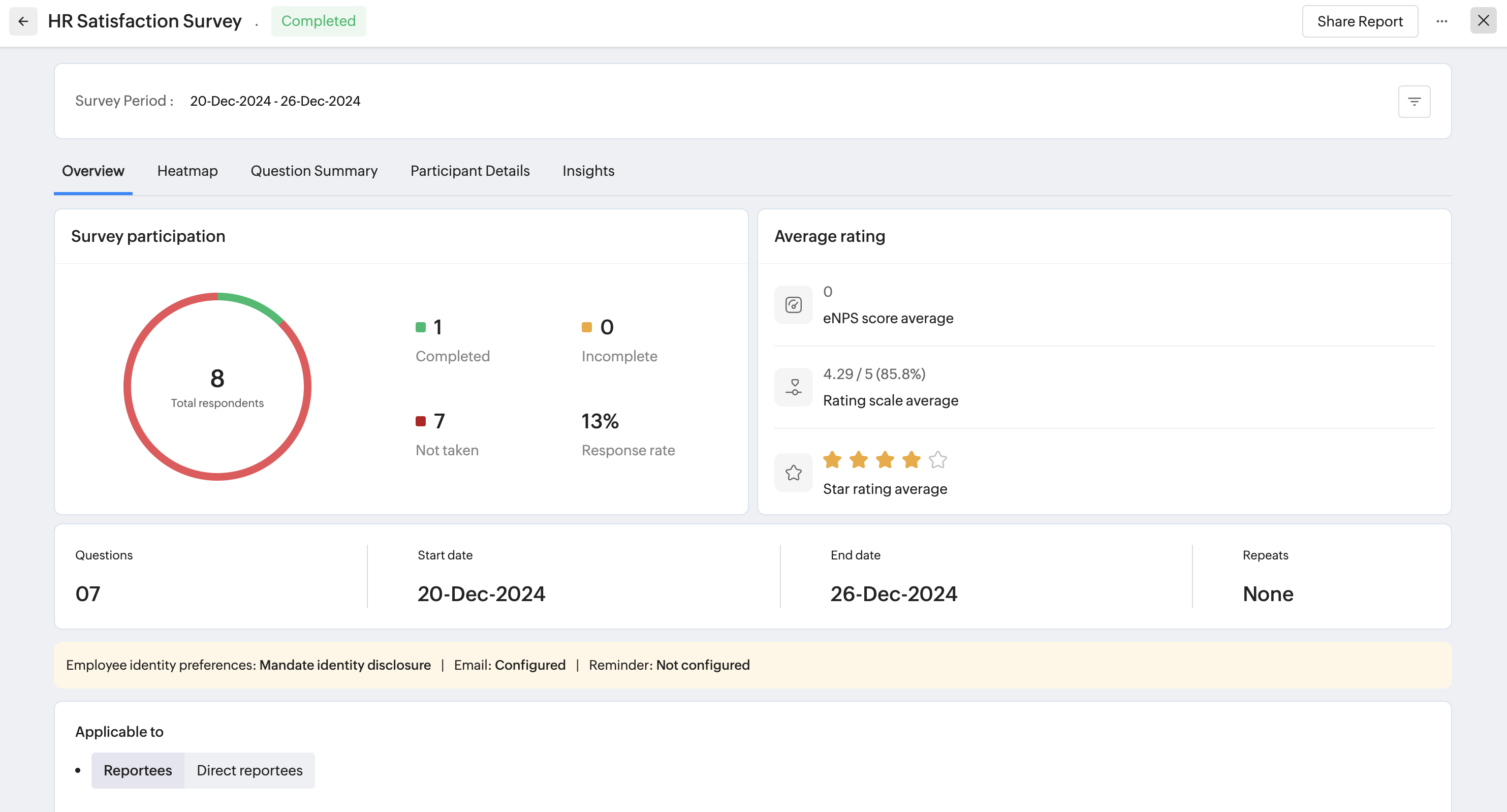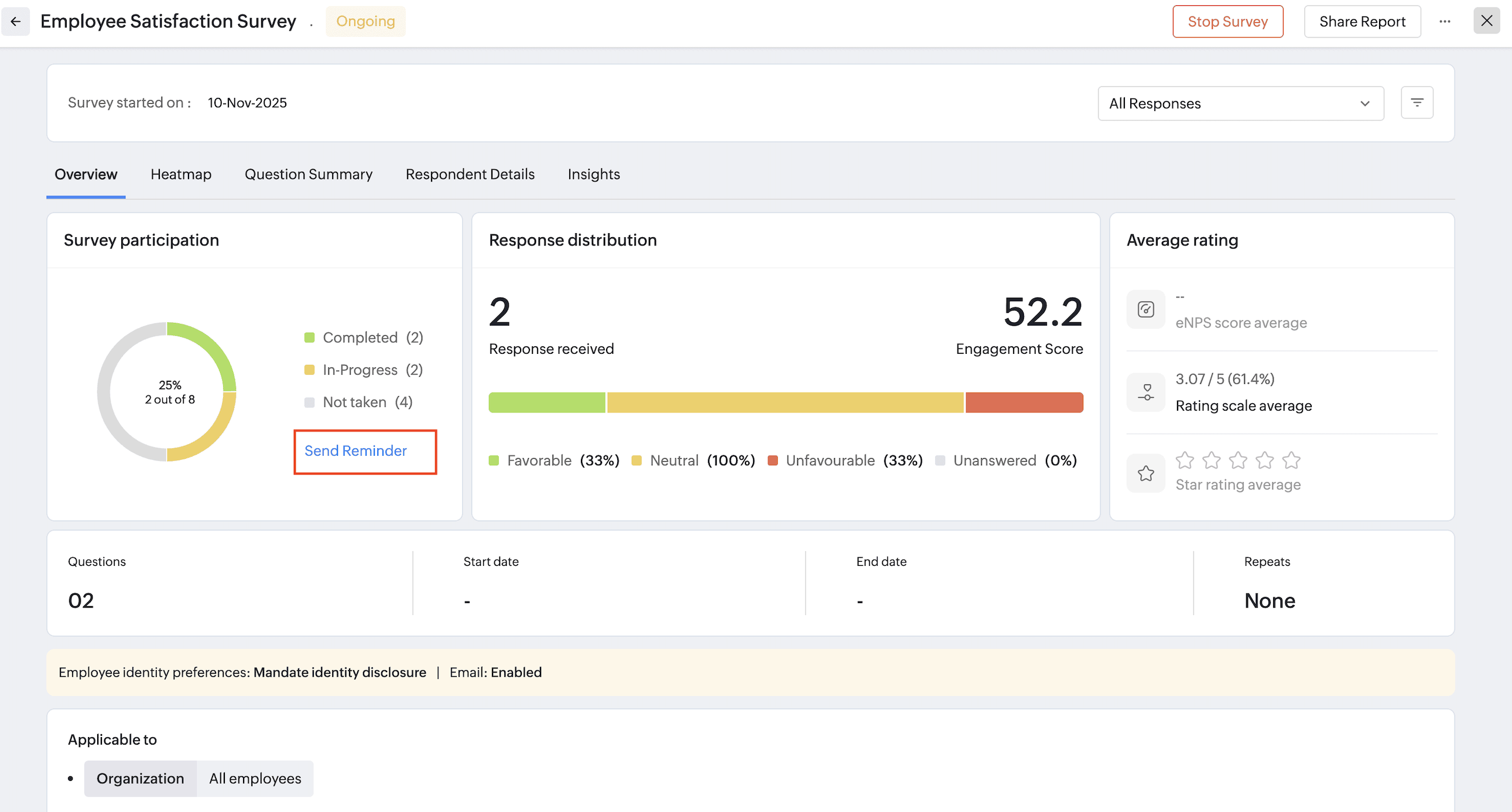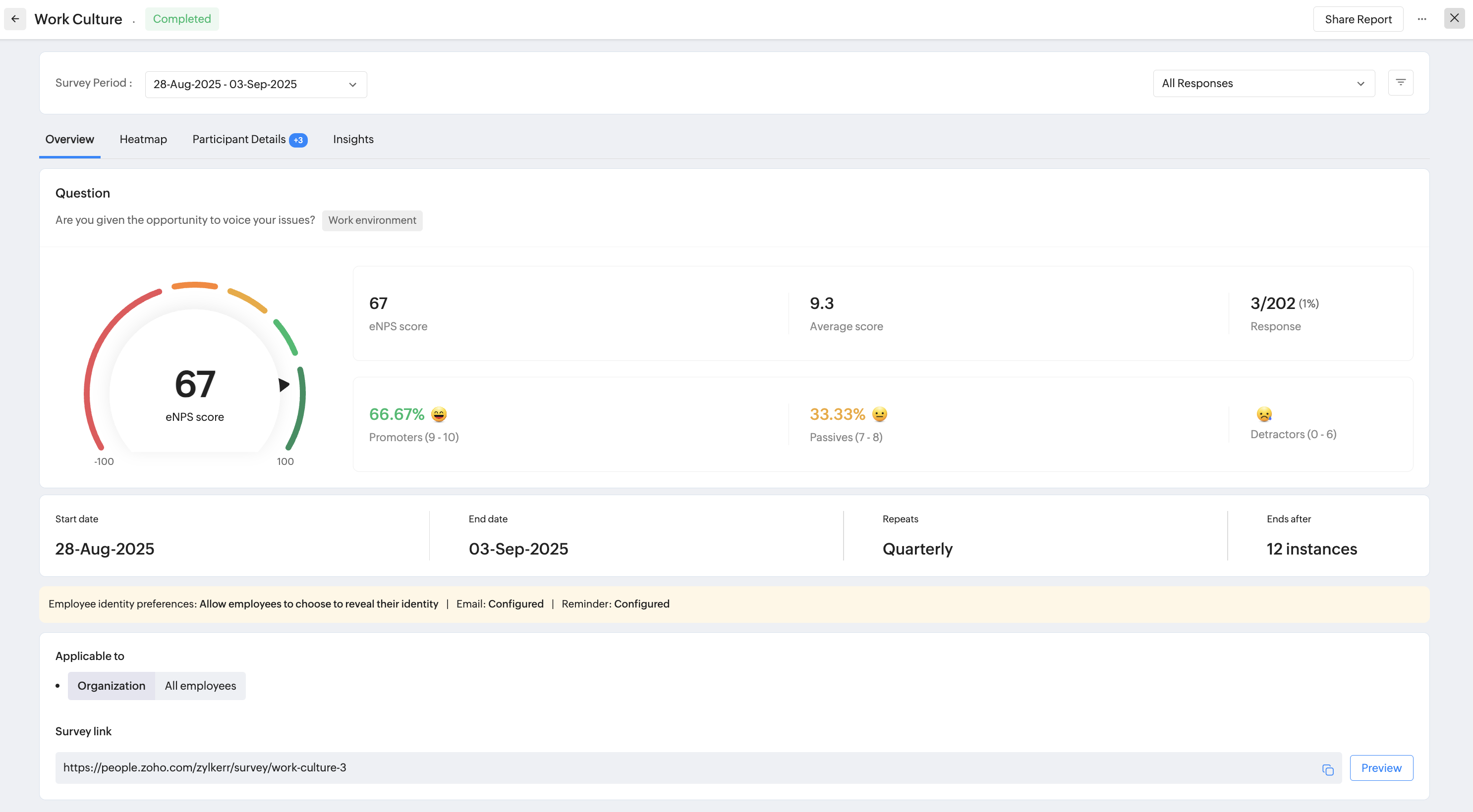 eNPS, Pulse, and Engagement surveys can be setup to run multiple times. You can view the recurrence order, response % and access corresponding reports directly, To view this option, click on the Recurrence icon () .