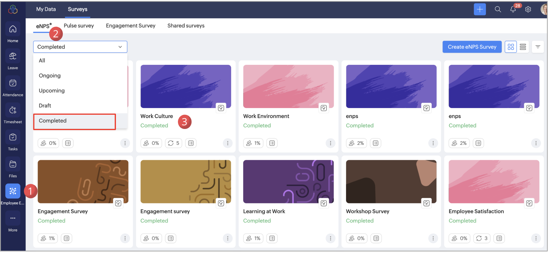 This option will be available for all recurring surveys and can be accessed from the Surveys tab in Employee Engagement service.To access the recurring survey order, navigate to Employee Engagement > Surveys > eNPS / Pulse Survey / Engagement Survey tab.