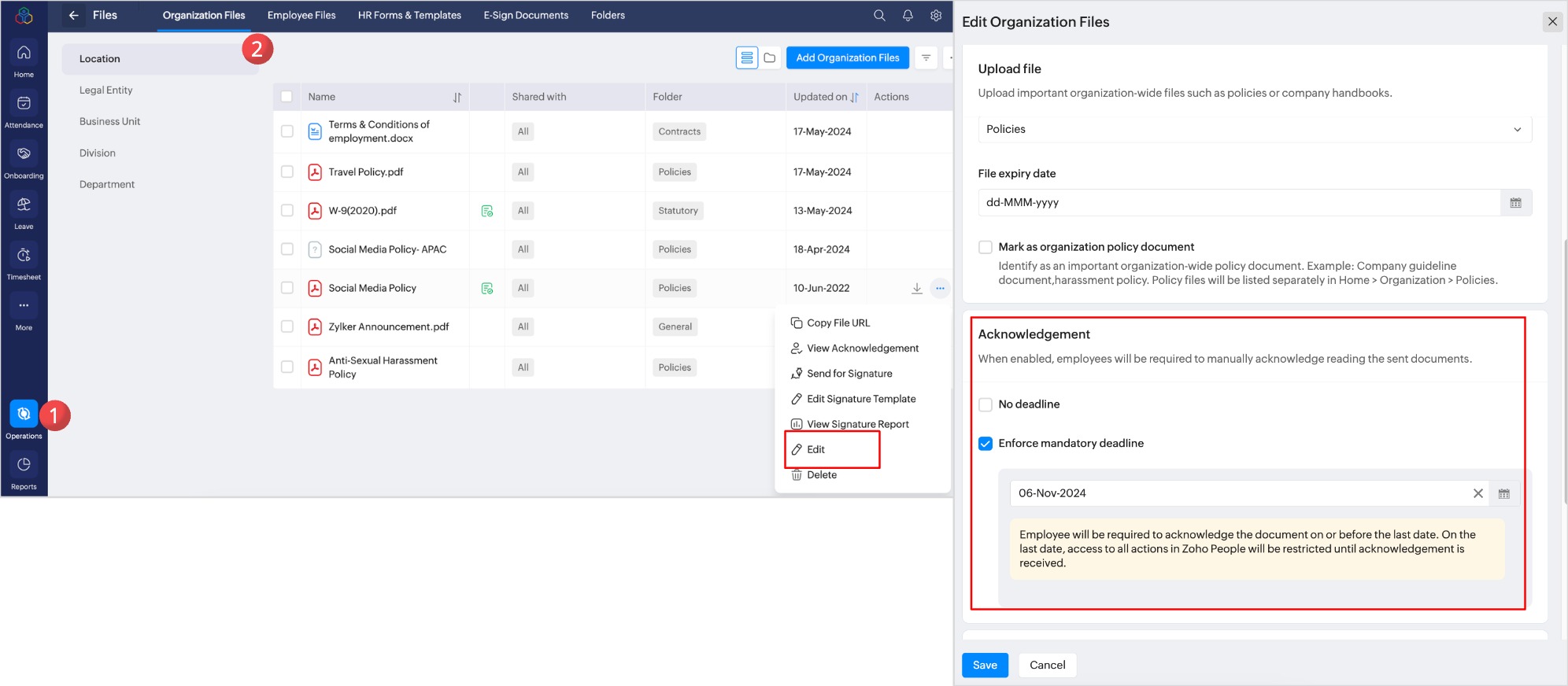 1. Go to Operations > Files, navigate to Organization Files or Employee Files which you would like to send for acknowledgement.