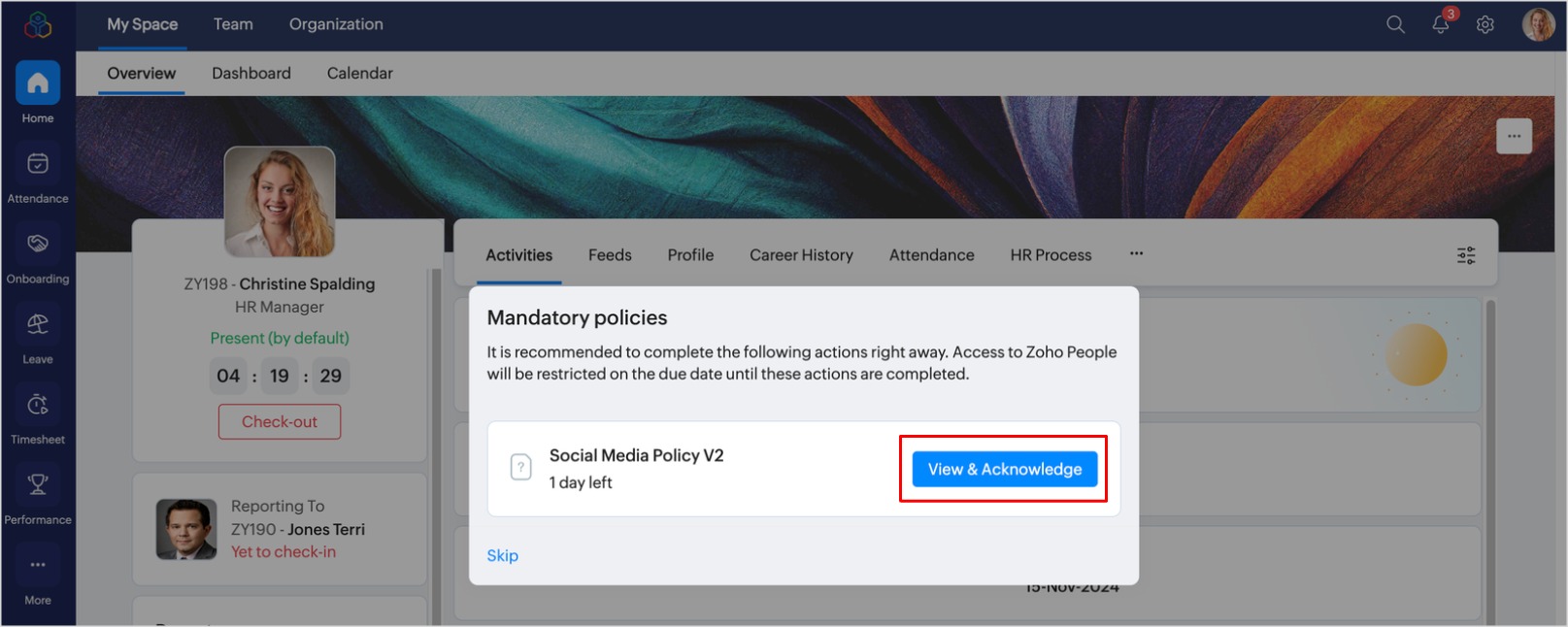 If mandatory acknowledgment is enabled for a file, a pop-up will appear when employees log in to Zoho People, reminding them to view and acknowledge the document. They can skip this pop-up until the due date. If they don’t acknowledge by then, they won’t be able to access Zoho People services until they acknowledge.