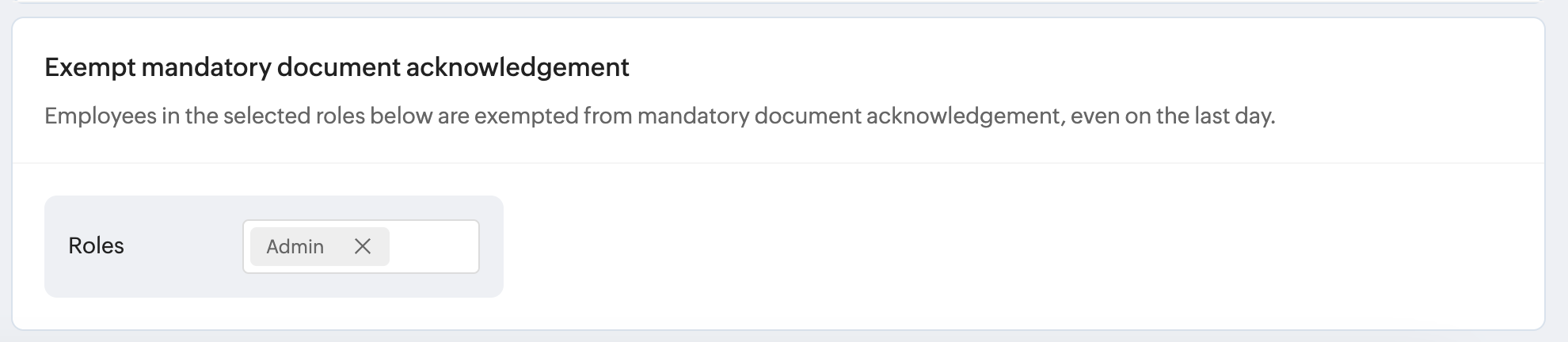 Select the user roles that should be excluded from the mandatory document acknowledgement requirement. Users in these roles will be able to access Zoho People even after the acknowledgement due date, while other users will be restricted until they acknowledge the documents.