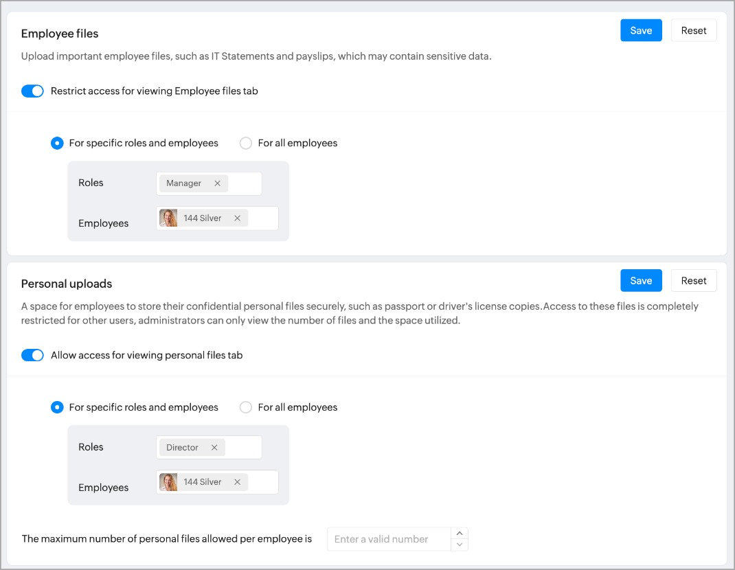 To set restrictions on who can access the Employee Files tab, enable Restrict access for viewing Employee files tab and select the following: