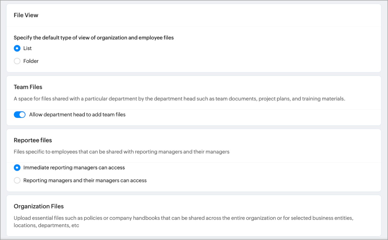 What is File Service in Zoho People? The Files service in Zoho People is a centralized repository for storing and accessing your organization's files. You can send documents for e-signing and manage all e-signed documents in one place. Additionally, ...