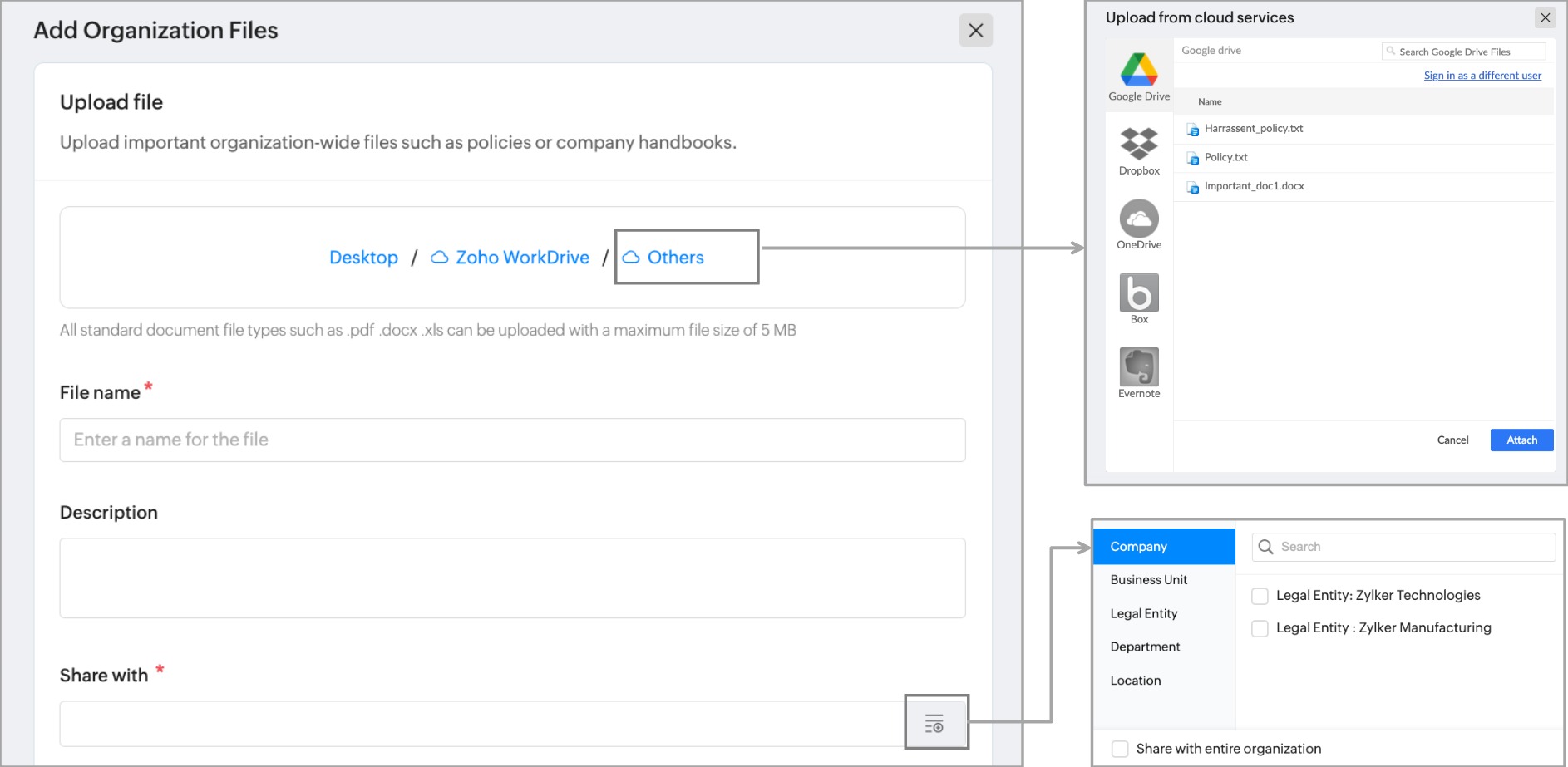 2. Select the file you would like to add. You can either upload the file from your desktop, from Zoho WorkDrive or other cloud services which includes: