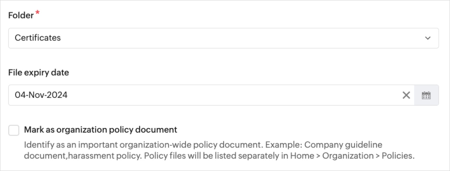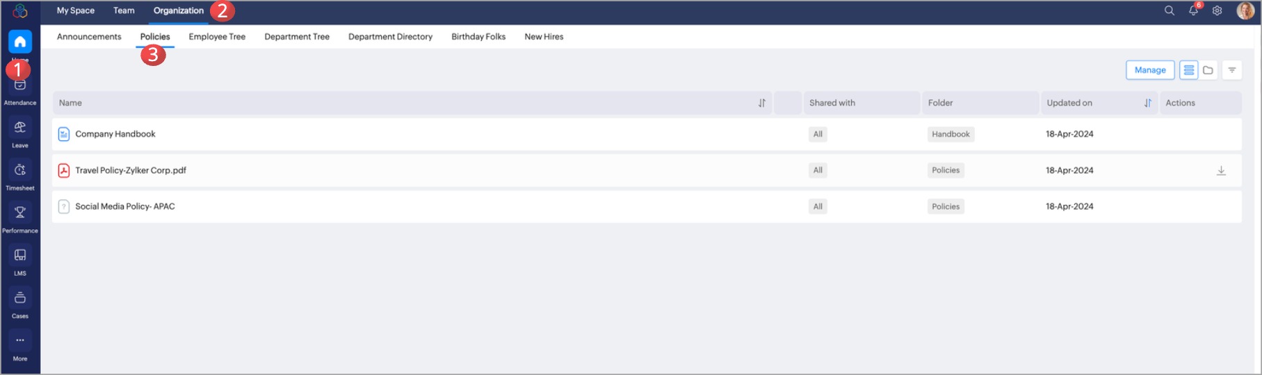 If the file is marked as Organization Policiy Document, applicable employees can find it under Home > Organization > Policies tab.
