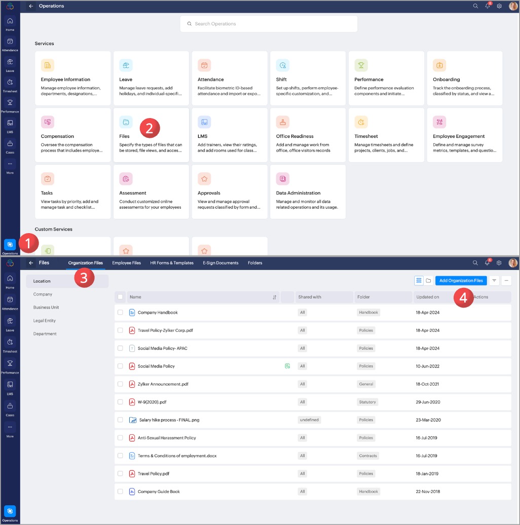 Overview Operations in files is an administrator space where they can add and manage Organizational Files, Employee Files, HR Forms and Templates, and Folders. Additionally, administrators can send files for E-Sign through integration with E-Sign ...
