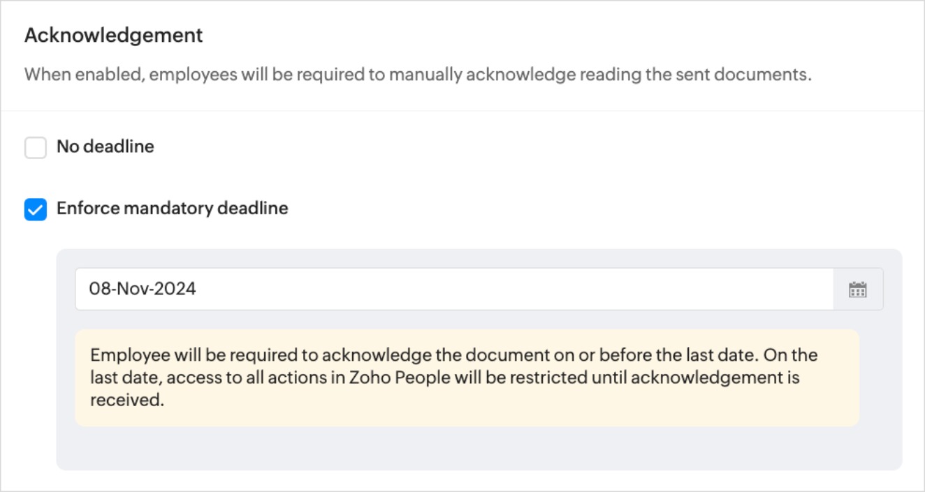 7. Enable the file document acknowledgement to require users to read and acknowledge the document. For more information, refer to Document Acknowledgement.