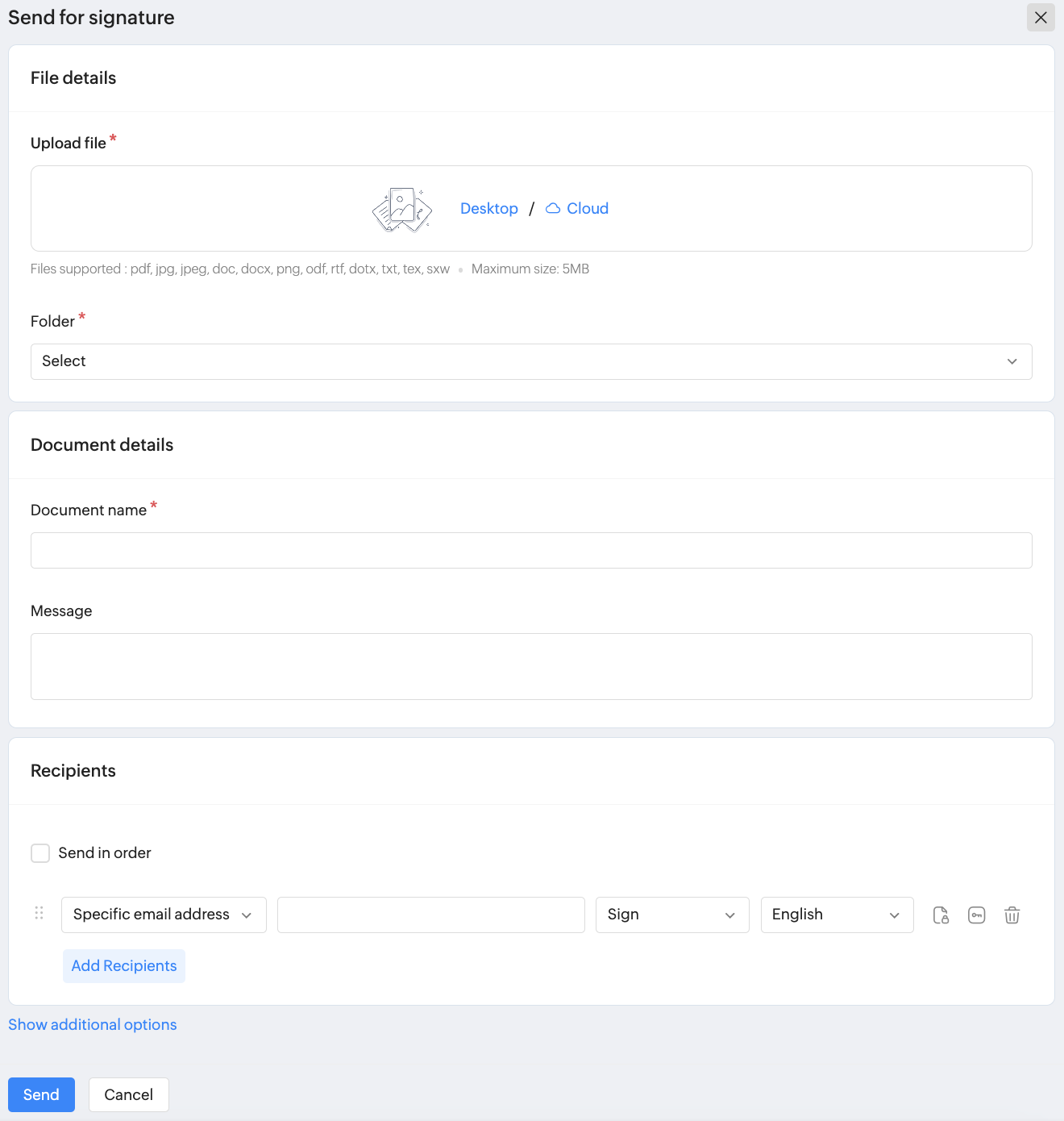 Select Send in order check box to send the document singed in order. For example, if manager and employee are recipients in the order, manager needs to sign the document first to move the document to employee for signature.