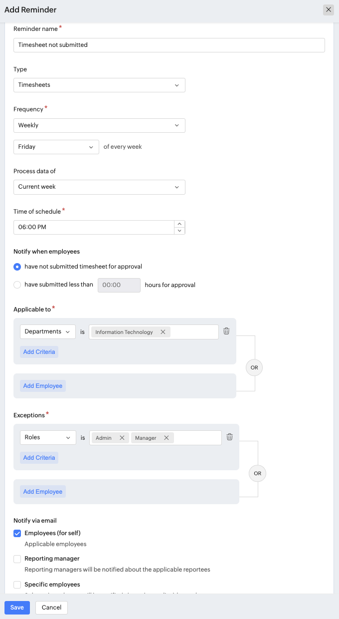 In this example, the employees are notified when timesheet is yet to be sent for approval, applicability is set for IT department staff, exempting only Admins and Managers of that department.