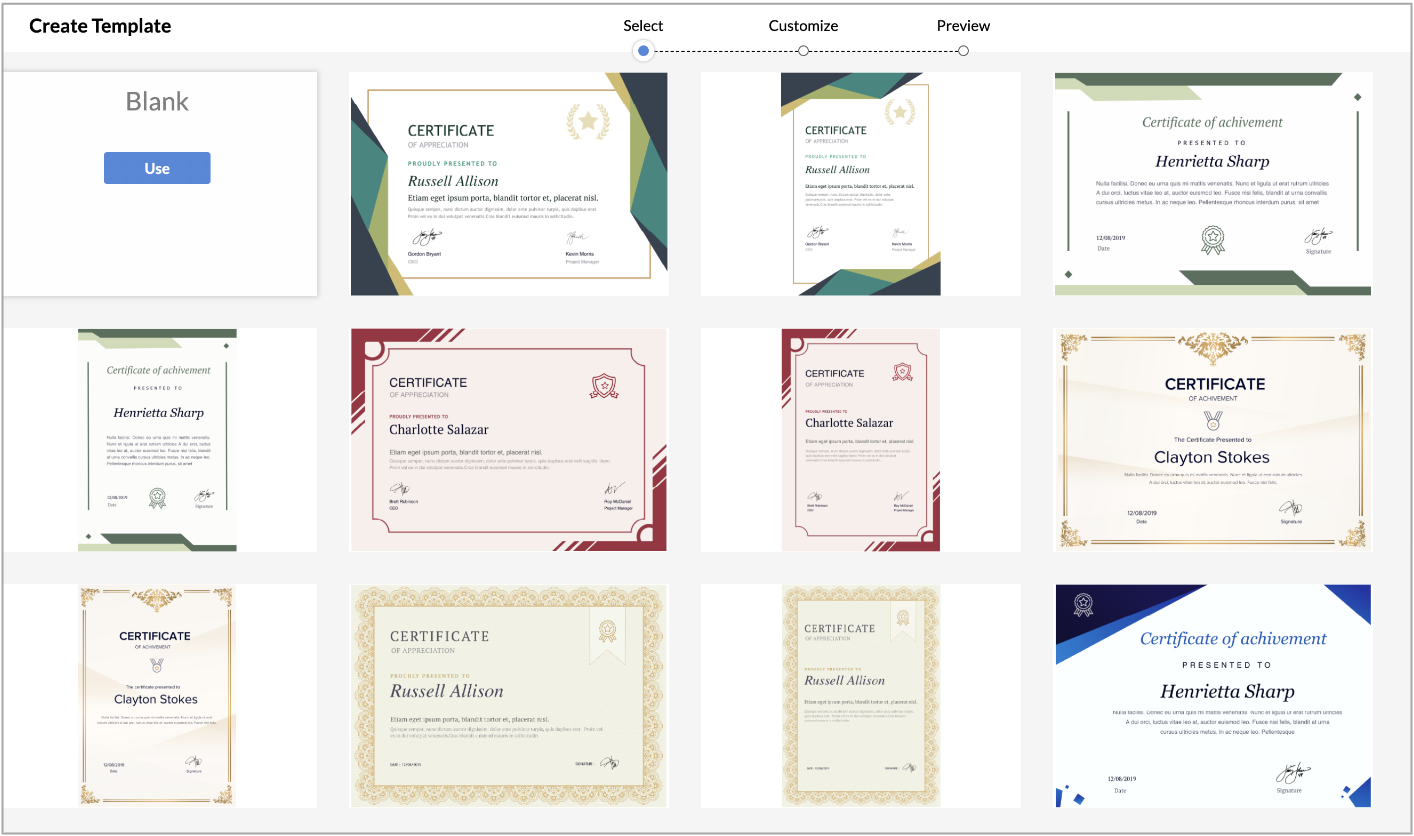 Course certificates can be created and used to reward learners who complete a course. In Zoho People's LMS, you can create and customize certificates from a variety of pre-designed templates and grant them to the members of the course after successful completion.