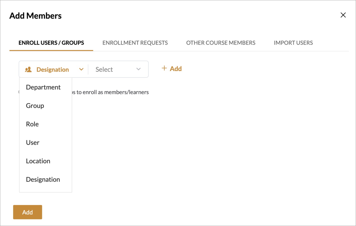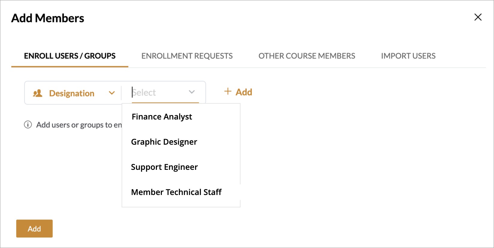 Additionally, the admin can now add users by selecting a Designation in the Enroll Users/Groups tab. This will automatically enroll all users with the selected designation in the course.