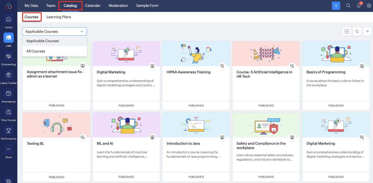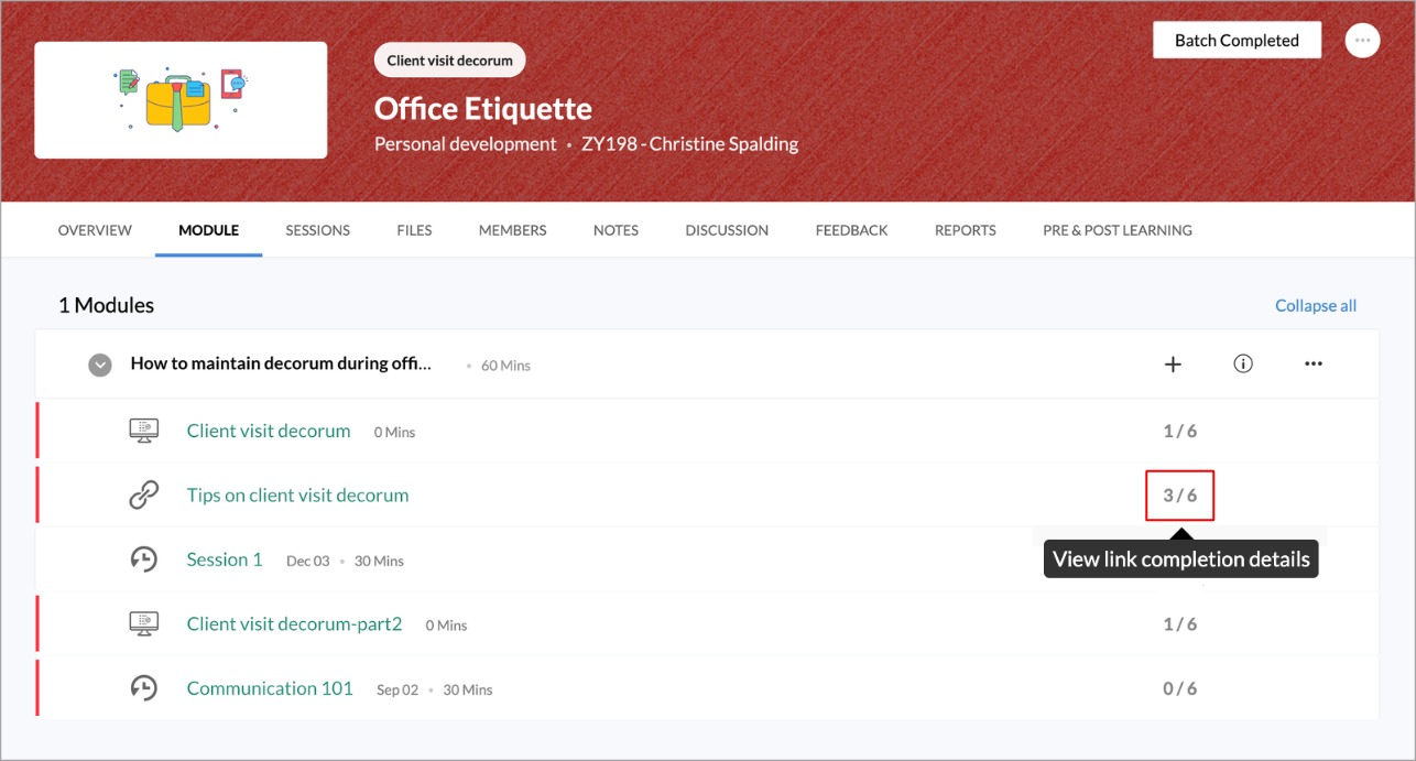 Single or multiple sessions can be conducted under each module. Each session will have a trainer, and the type of training can be either classroom or e-learning (or both). Sessions can be created only for Blended learning courses.