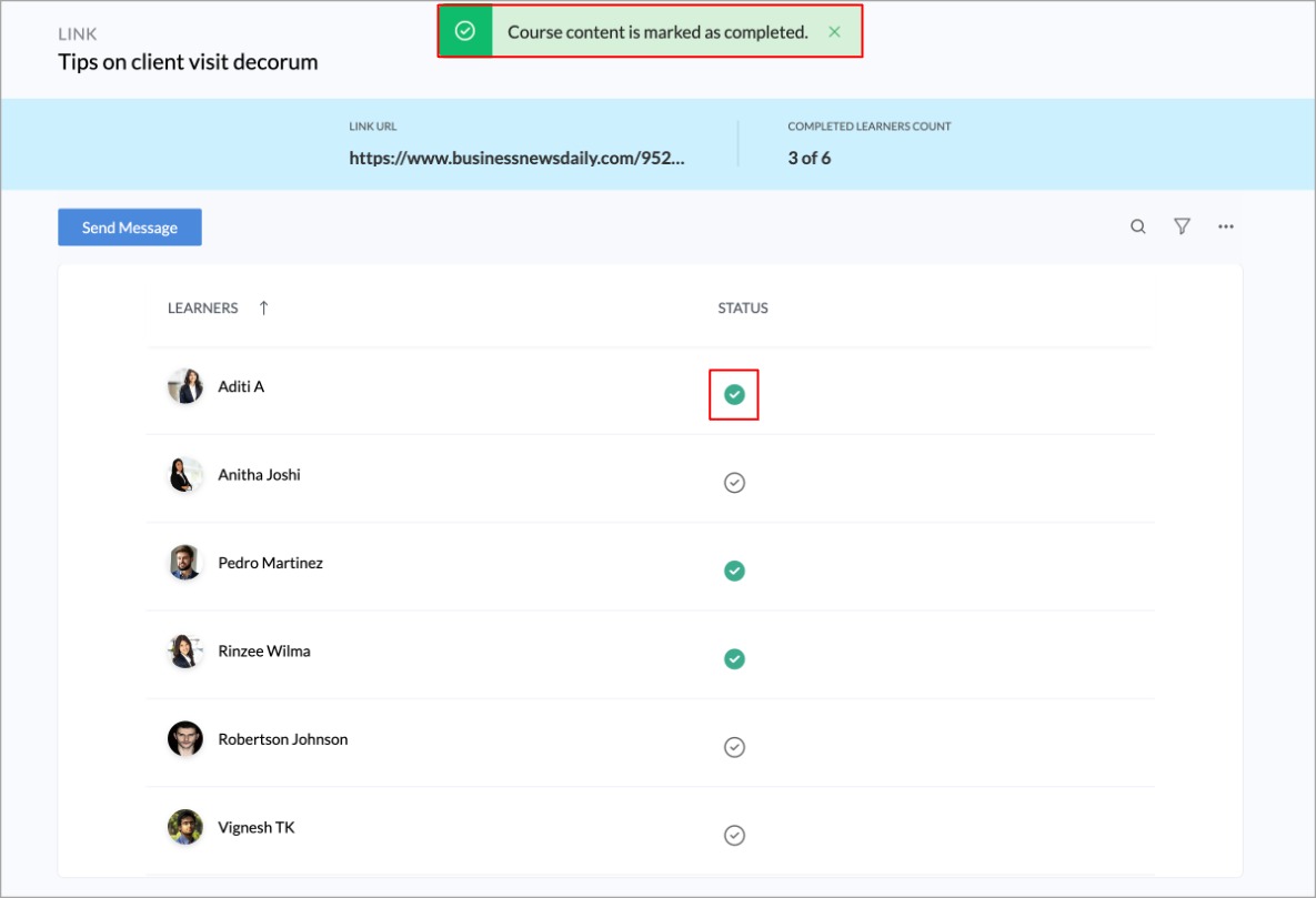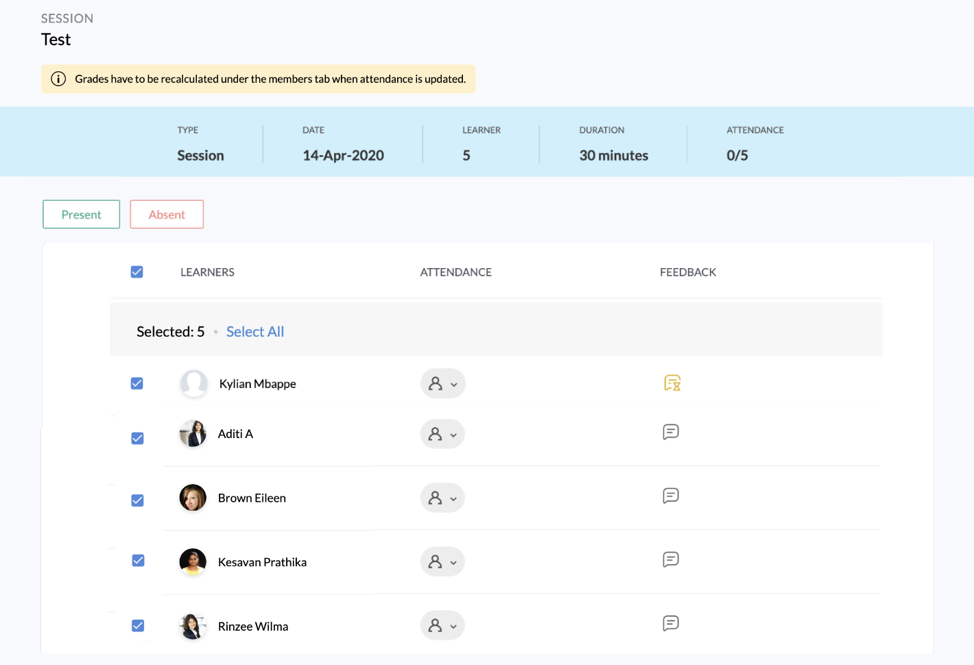 Course admin can mark attendance in bulk, setting learners in the list as either present or absent.