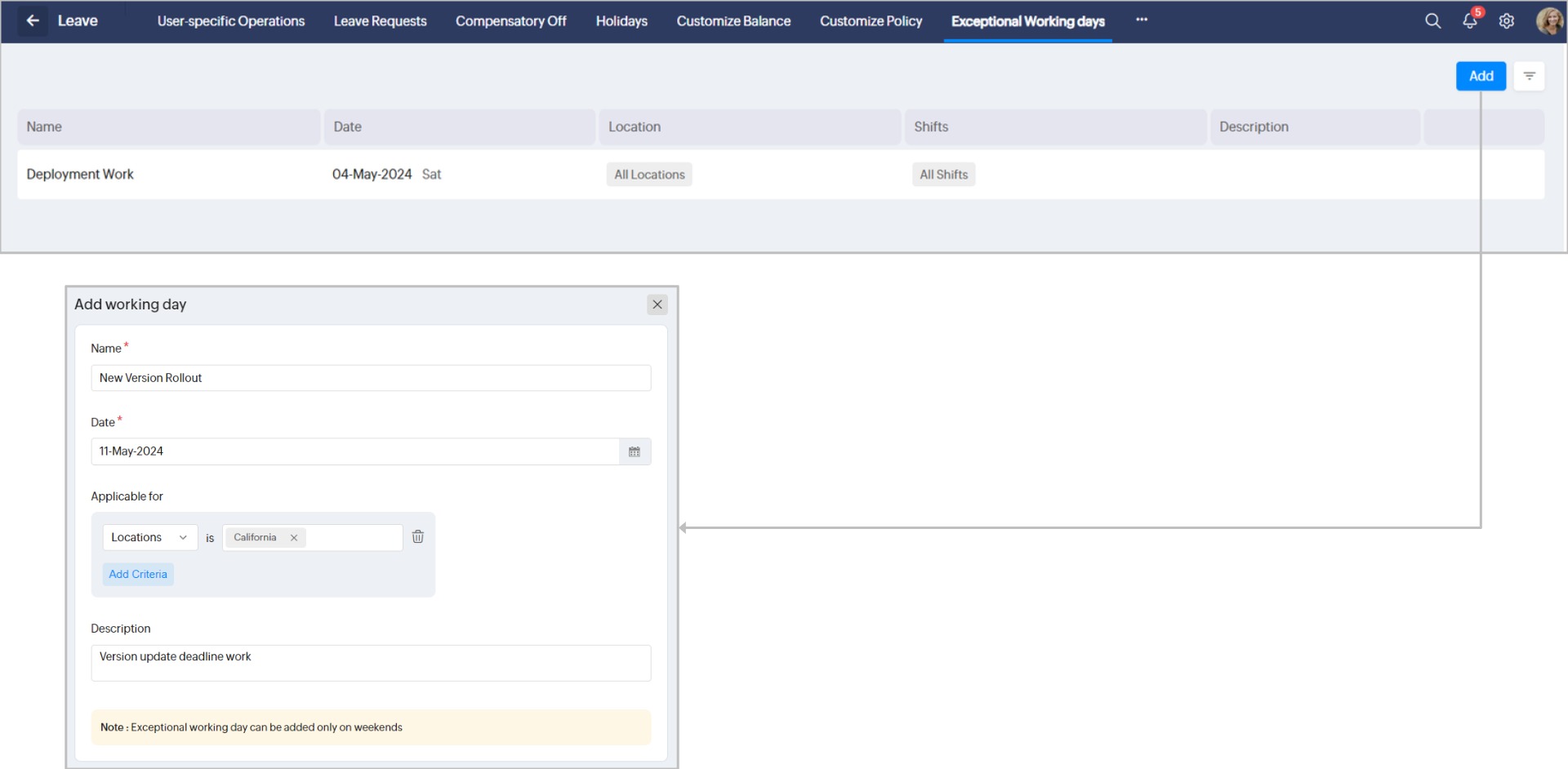 An exceptional working day can be declared when employees are required to work due to exceptional circumstances, such as meeting an important project deadline. It is added for employees belonging to a specific location or shift.