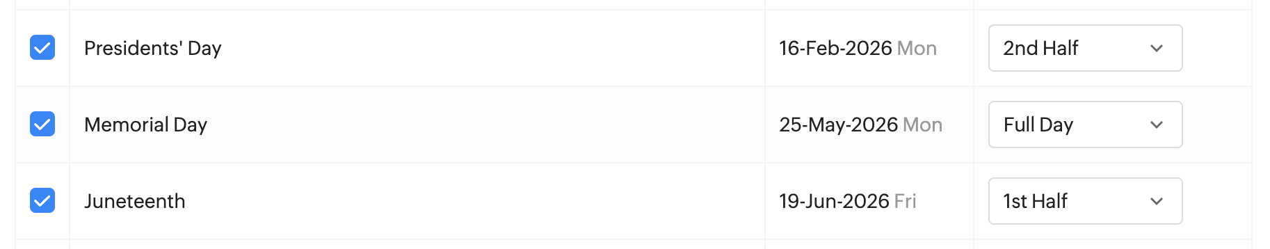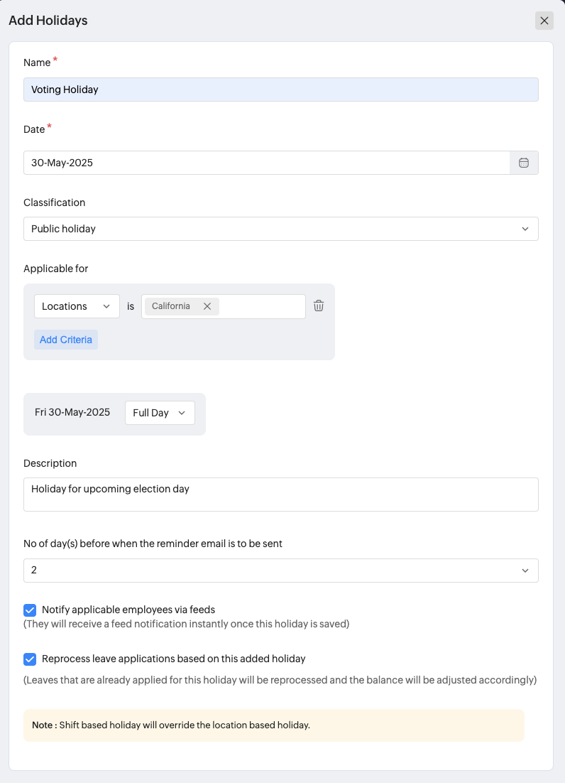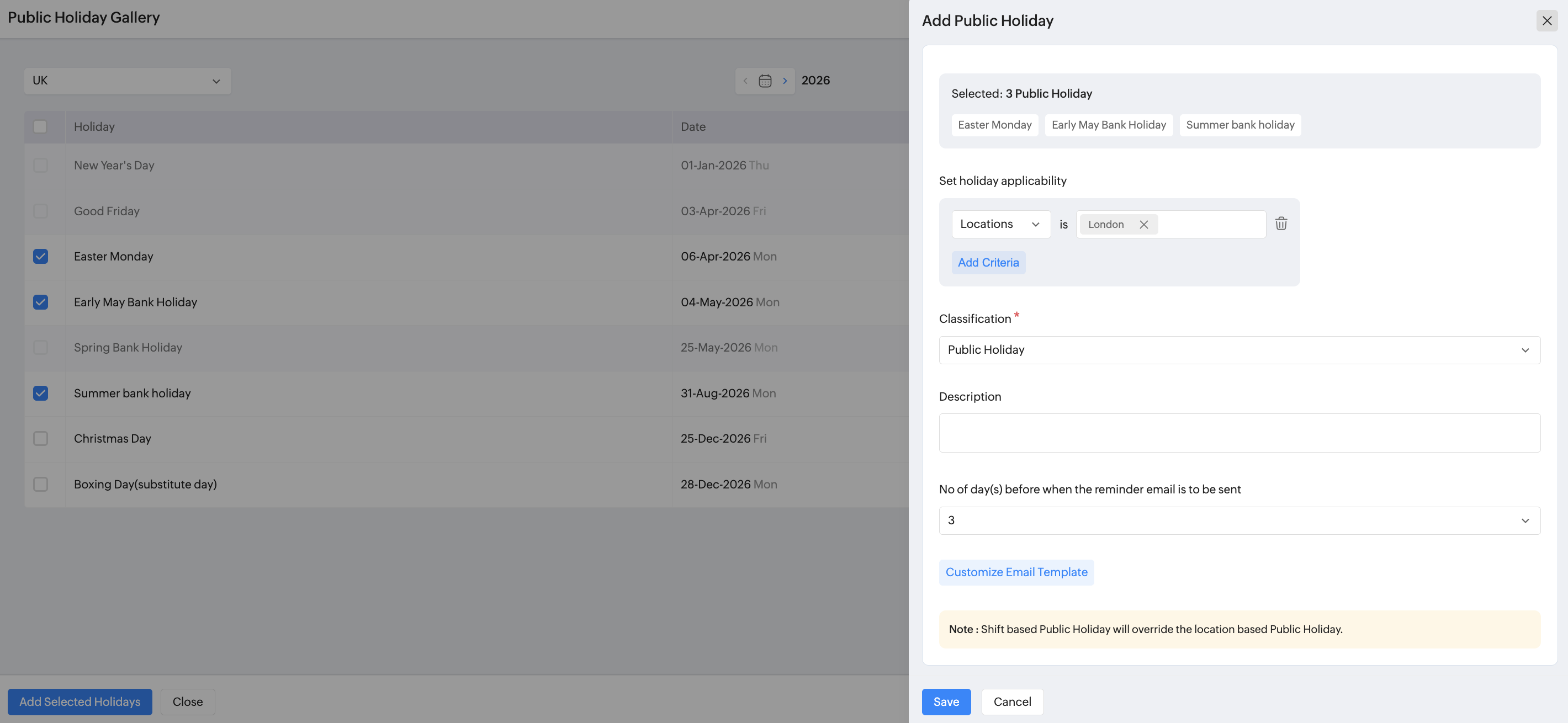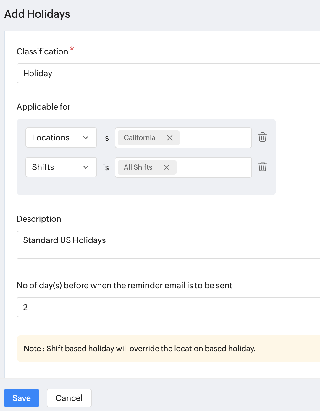 Add Holidays lets you manually create and assign holidays based with shift or location based applicability.