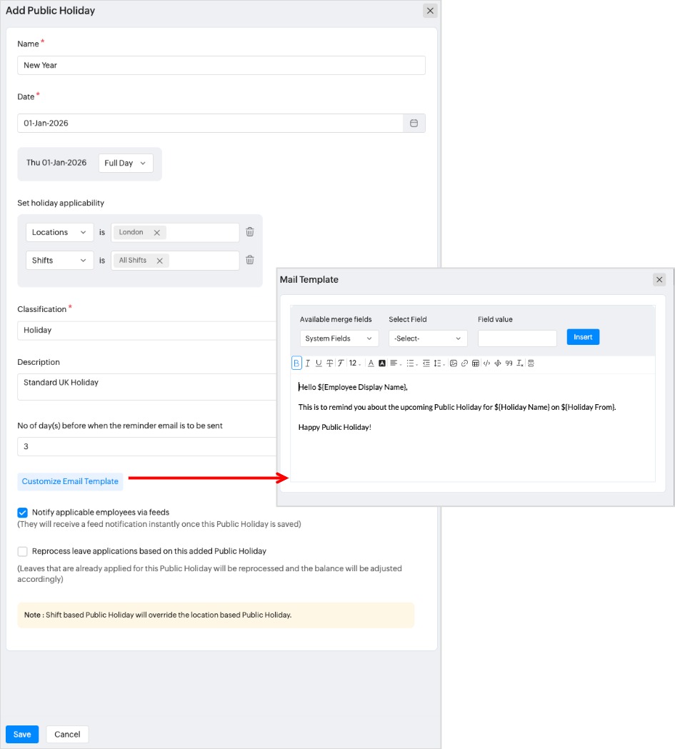 9. Use Customize Email Template option, to customize the reminder email for this holiday.