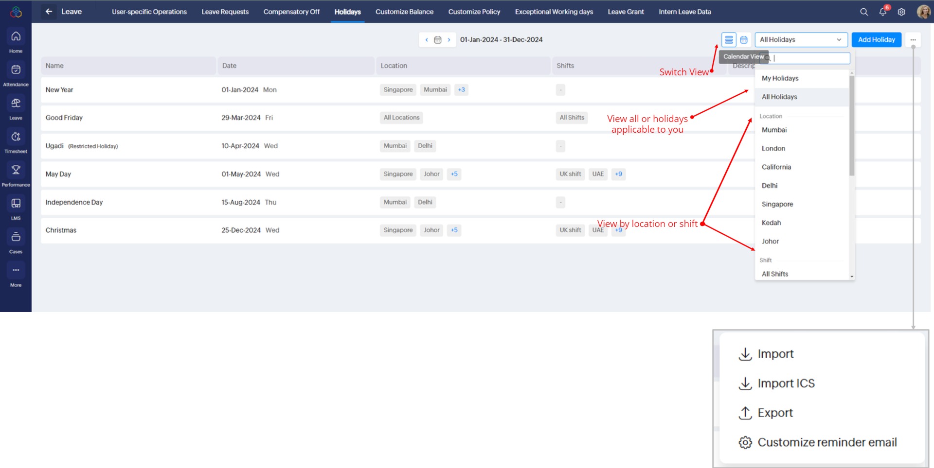 2. You can also use the drop-down to list holidays by Shifts or Locations.