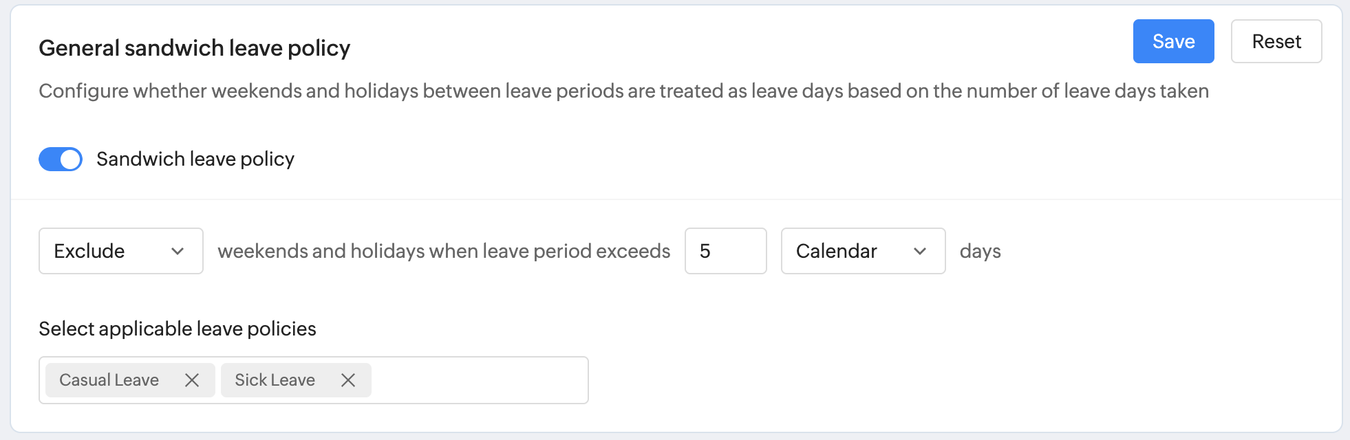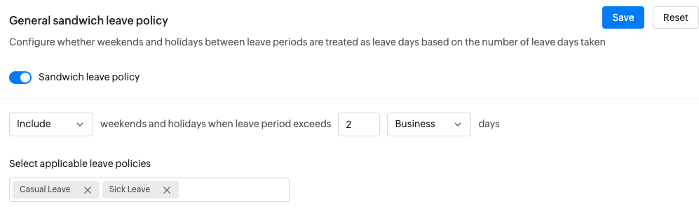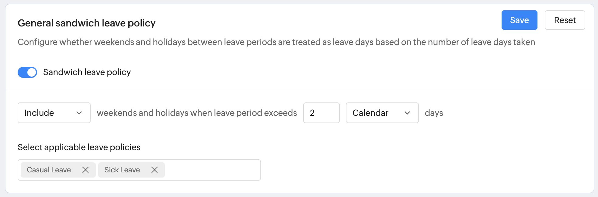 To enable leave sandwich rules for specific leave policy, refer to Sandwich leave policy.