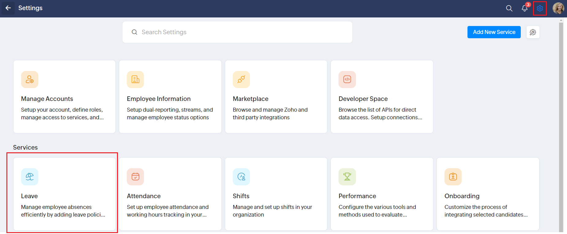 To access leave service settings, go to Settings (gear icon on the top-right corner) > View All > Leave (Visible only to Super Administrator and roles with Administrative Access).
